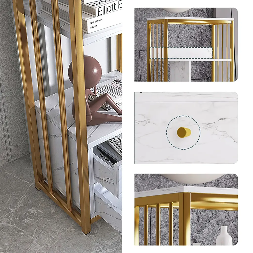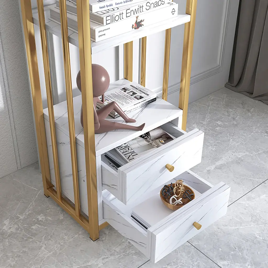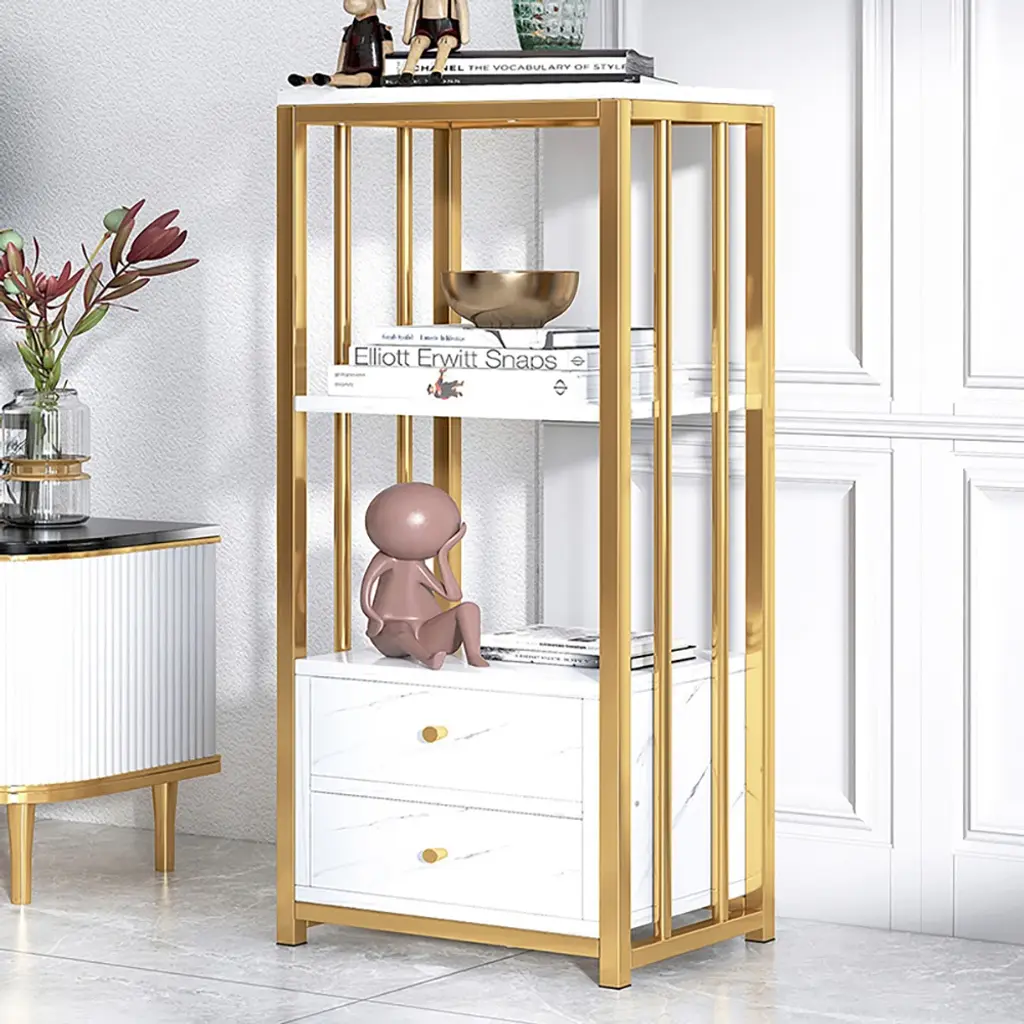 Designed with a white marbling surface and framed in gold finish metal, this display cabinet showcases a touch of Nordic appeal to complement nearly any layout style, catching your guests' look greatly. The open shelves with backboards are perfect to hold decorative items, while 2 generous drawers open to reveal interior space for a variety of storage and display options. Try it in the kitchen to store stoneware, stemware, and china for special occasions. Or, place it in your study to store your treasured books, magazines and more. As versatile as handsome, this piece looks great and adds function to almost any space.