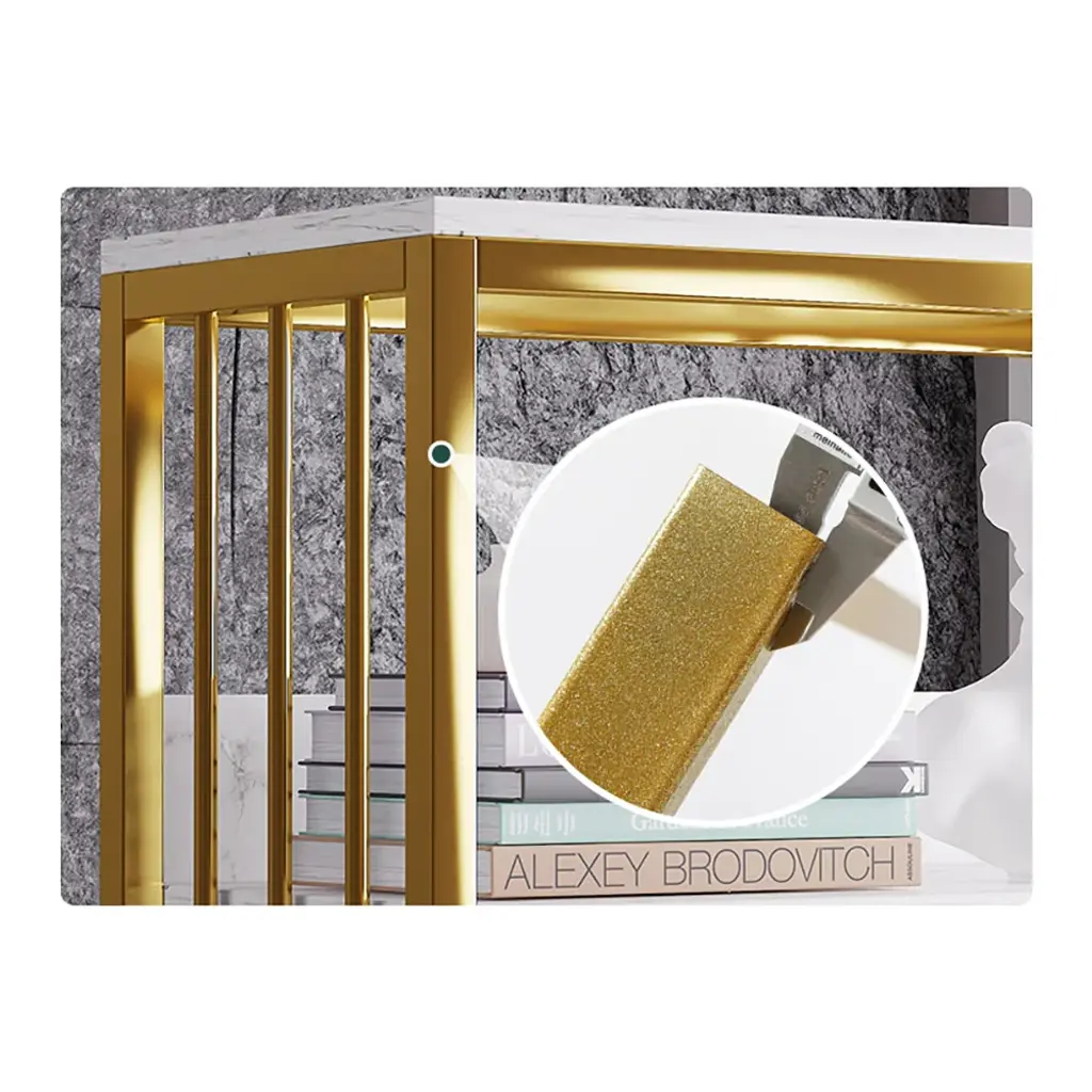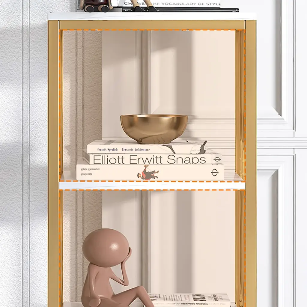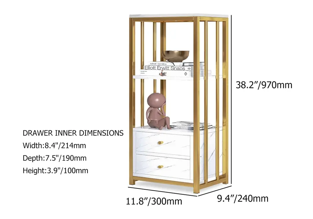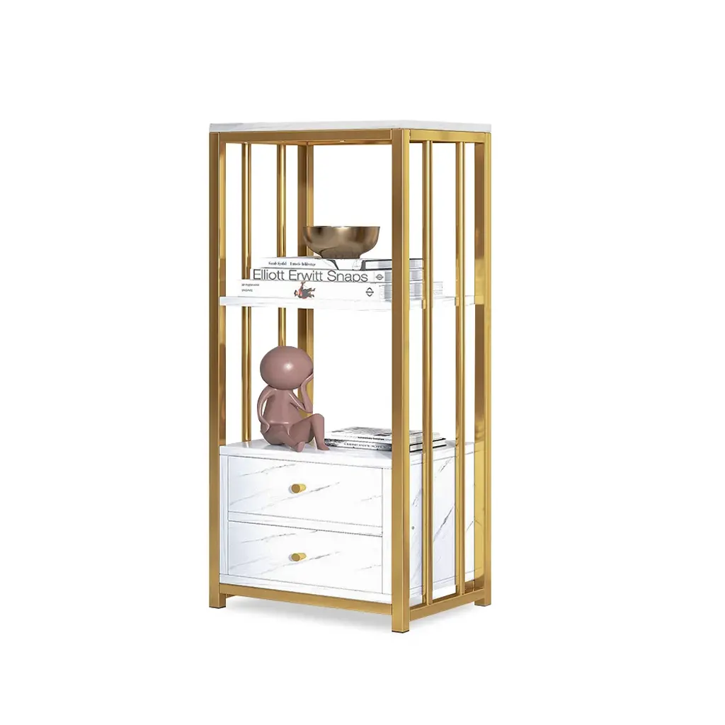 Designed with a white marbling surface and framed in gold finish metal, this display cabinet showcases a touch of Nordic appeal to complement nearly any layout style, catching your guests' look greatly. The open shelves with backboards are perfect to hold decorative items, while 2 generous drawers open to reveal interior space for a variety of storage and display options. Try it in the kitchen to store stoneware, stemware, and china for special occasions. Or, place it in your study to store your treasured books, magazines and more. As versatile as handsome, this piece looks great and adds function to almost any space.