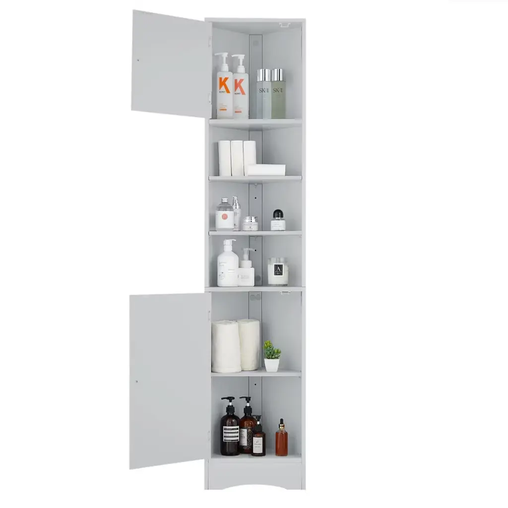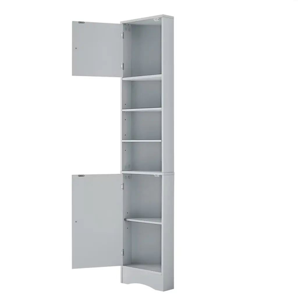 [High-quality Material]: Made of premium P2 level MDF boards, this cabinet is durable and sturdy and allows many years of use. Painted with grey finish, the surface is water-proof, easy to clean and brings a sleek look to your room.[Space-saving Design]: The bathroom cabinet is designed as a triangle shape to stand in the corner to save more space in your home. The compact cabinet fits small spaces and adds perfect storage space to all-sized bathrooms. Hides toiletries and other bathroom items behind cabinet door for a fresh and clean appearance.[Adjustable Shelves]: This tall corner cabinet includes three removable and adjustable shelves that allows you to install it in the up, middle or down part of the cabinet to divide the storage space. What's more, each shelf can be adjusted to different heights according to the pre-drilled holes. It totally satisfies home storage needs.[Provide More Storage Space]: This tall cabinet has one open storage part in the middle and two storage cabinet with enclosed doors up and down. You can put soaps, tooth brushes and other daily stuff on the up shelf and towels, shampoos, body lotion and other bathroom essentials in it to keep dust away. Furthermore, Closed storage cabinet with doors can keep your stuff dry and clean.[Design Details]: The groove pattern on the doors and curved line in the base add more elegant elements to this cabinet. Wood round door handles, magnetic door button and stainless steel hinges comfort customers when open and close the door.[Assembly Required]: Carefully packed and all hardware needed are included. This product needs two people to install by following the clear instruction manual.