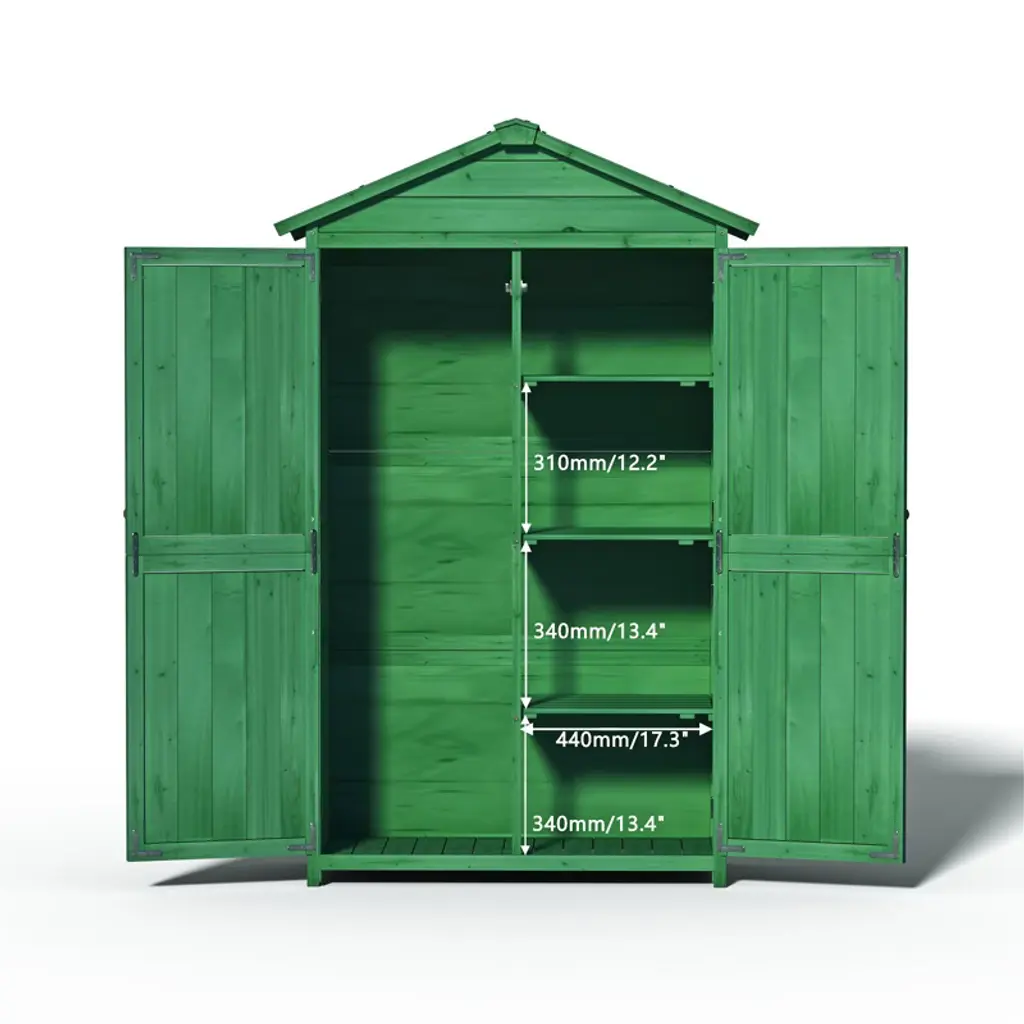 [Durable Fir Wood Frame] This storage shed is made of solid fir wood construction with stained coating which ensures long service lifespan. With its off-the -ground design , the utility tool shed is enough durable and stable for outdoor using. [Spacious Storage Room] With 4-tier shelves,all of them are removable, and 1 large space inside, the tool organizer is deal for storing different tools and accessories such as watering can, spades, pots even some long tools etc. Each shelf of this tool storage cabinet can hold 33 lbs which is suitable for many kinds of outdoor equipment. [Waterproof Roof] The tilted asphalt roofs and water-resistant coating protect the storage shed from bad weather like wind and rain while keeping the equipment inside from being destroyed by the water. [Double Doors&Handles] To secure your tools, the backyard shed is perfect for protecting your equipment's damage from small animals or wind. With 2 handles in the doors, it allows quick and easy access to your tools. [Dimensions] Overall Dimension:35.6x18.1x66.15inch(LXWXH);Each shelf Dimension:13.4x17.3inch(LXW); For detailed size, please refer to the dimension image.