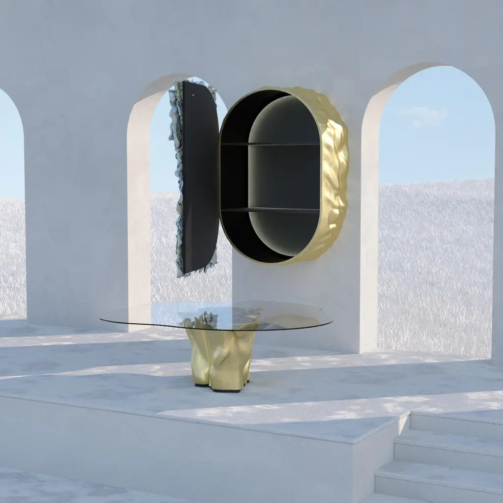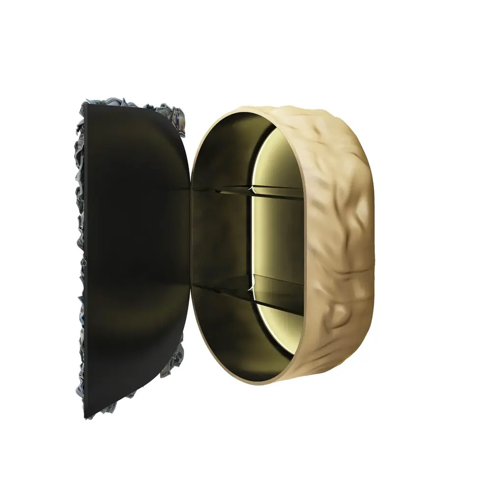 Money cabinet boasts exceptional Paul Rousso’s sculptural money banknotes, which were meticulously placed into the doors of the cabinet, to enhance its curves and perfect proportions. Made of resin and hand sculpted acrylic, the delicate details are the result of exceptional craftmanship.