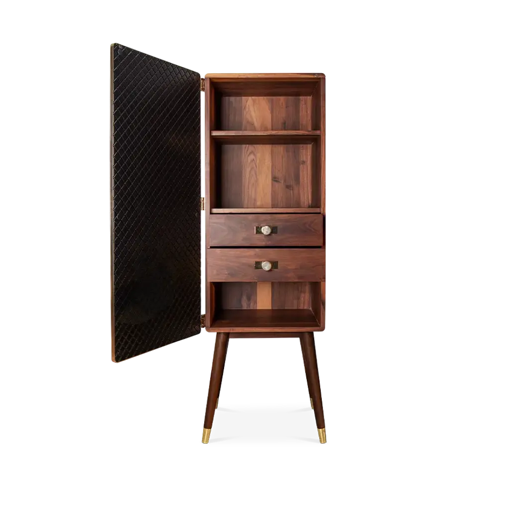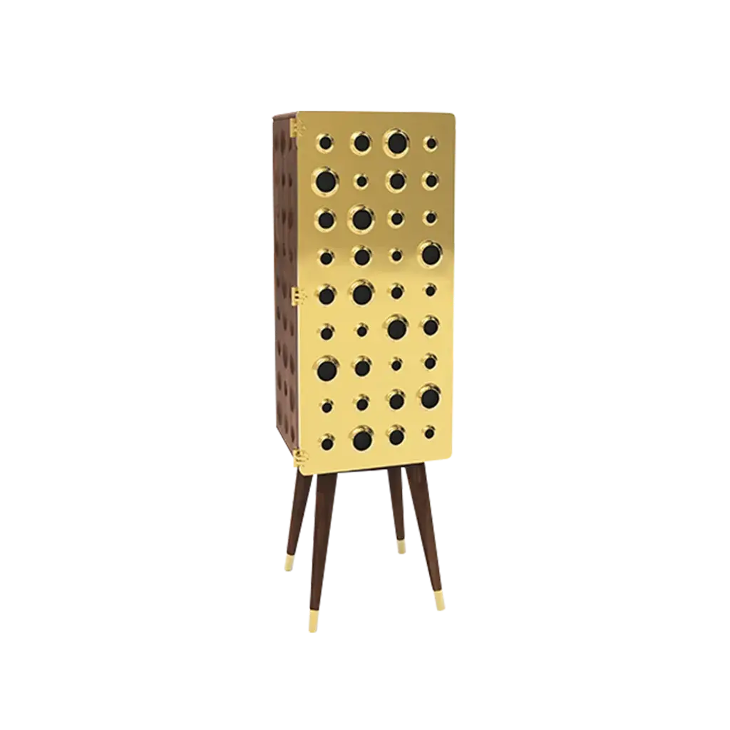 A stylish and functional piece of furniture that blends mid-century charm with a contemporary design style. Monocles features tapered legs with brass ferrules and a body built in solid walnut wood, both sides and back engraved with stunning circles that are inspired by mid-century style.