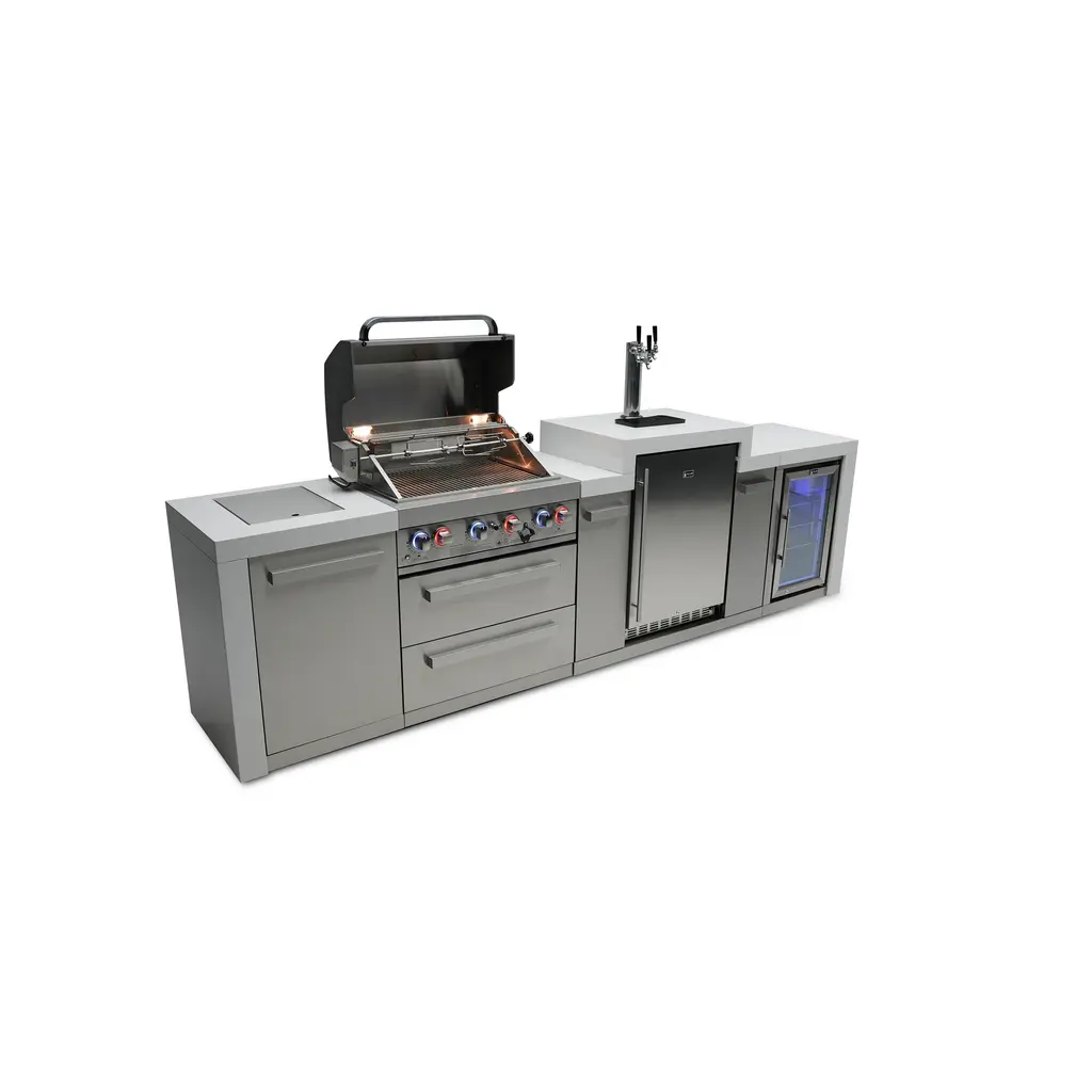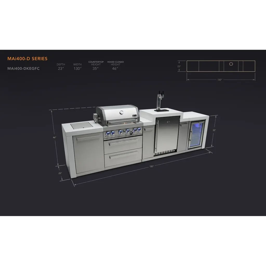 ISLAND FEATURES - The MAi400-DKEG 44-inch island gas grill arrives almost fully assembled (modular attachment required) and features 4 tubular stainless steel high efficiency burners with a rear height-adjustable ceramic infrared rear burner and a standalone side burner that produce 78000 BTU’s of heat output. The grill also features a stainless steel warming rack, 8mm stainless steel cooking grids and a generous cooking area of 28-inches x 18-inches (792 square Inches of total cooking area).ADDITIONAL FEATURES - A double lined grill hood with temperature gauge is standard for maximum heat retention. The grill has two cooking surface halogen lights, On/off red/blue changing control knob lights, a bottle opener, electronic ignition, easy access full front pull-out grease tray for easy cleaning, white granite countertops, plus storage drawers and cabinets. Your outdoor kitchen will also come with gliding castor wheels for smooth and easy-to-maneuver movement and increased stability.INCLUDED ACCESSORIES - You will also get a 120V 4-Watt heavy duty electric motor rotisserie kit (holds up to 25 lbs), chopping board, white granite surfaces and waterfall sides, matching 90 degree corner cart with storage shelves, plus a waterproof outdoor rated weather cover to protect your grill from the elements.NATURAL GAS CONVERTIBLE - Although this outdoor grill comes with a propane hose and regulator as it comes ready for propane use, it can be easily set up for change into the more environmental-friendly natural gas, providing another convenient cost-effective, and reliable source of heat for outdoor cooking. (Sold separately).STAINLESS STEEL CONSTRUCTION - This modular outdoor kitchen is made of 304 marine grade stainless steel, a high-quality material that is known for its durability & resistance to corrosion & rust that also adds sleek, modern, and stylish addition to your backyard or patio. High, consistent heat output are made possible by the stainless steel burners, allowing you to cook a variety of food and meals with ease. The stainless steel components also make the grill easy to clean and maintain.KEGERATOR FEATURES - The Mont Alpi triple tap beer keg dispenser refrigerator with digital display allows for extra precision on temperature control for any environment. Included is a ball valve with male and female thread that makes soft drinks, seltzers and other beverages a possibility. The Mont Alpi keg center can accommodate a variety of different types and sizes of kegs (up to 3 slim kegs) allowing for the storage and dispensing of a wide range of beverages. Dimensions - 48” x 23” x 35”REFRIGERATOR FEATURES - The outdoor rated MAF refrigerator is made with heavy duty 304 stainless steel construction for durability and resistance to the elements. It comes with a stylish glass door for easy viewing of contents and interior blue lighting as well to improve visibility and overall user experience. Additional features include temperature control, adjustable shelves, and a lockable door to secure contents and prevent unauthorized access. Dimensions - 18 1/2” x 17” x 27”LIMITED LIFETIME WARRANTY - Mont Alpi grills are designed and built to last and we stand behind their performance. As a demonstration of commitment to our customers and their satisfaction, we offer a limited lifetime warranty (limitations apply) on all our products. Please do not hesitate to reach out to us If you have any questions or concerns regarding our products. We are here to help.PRODUCT DIMENSIONS - Height (hood closed) - 46” / Height (hood open) - 60” / Countertop Height - 35” / Depth - 23” / Width - 142” / Grill unit - 32”x 23”x 47” / Left Side Burner Unit - 25” x 23” x 35” / Right Side Unit - 25” x 23” x 35” / Rotisserie kit length - 44 1/2”