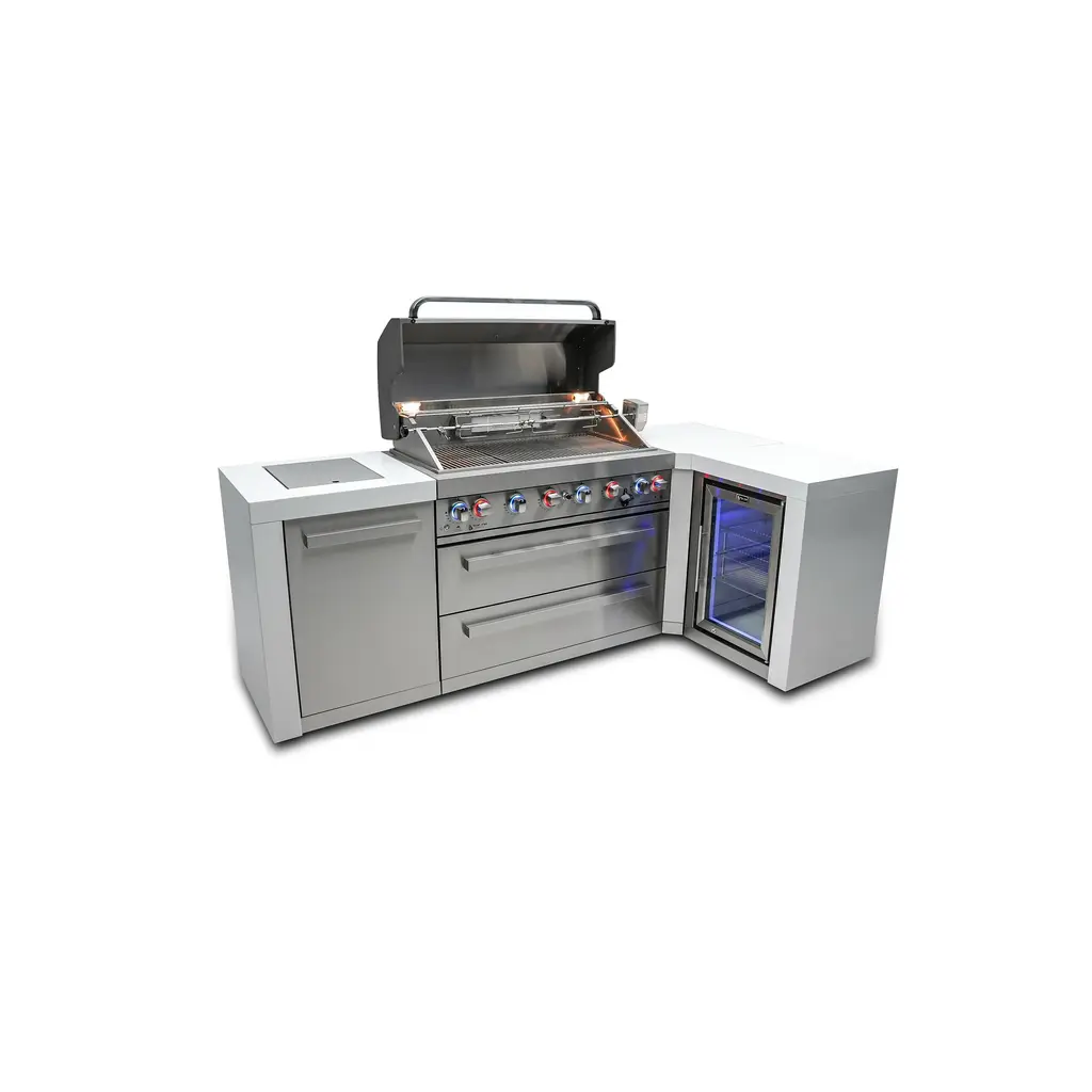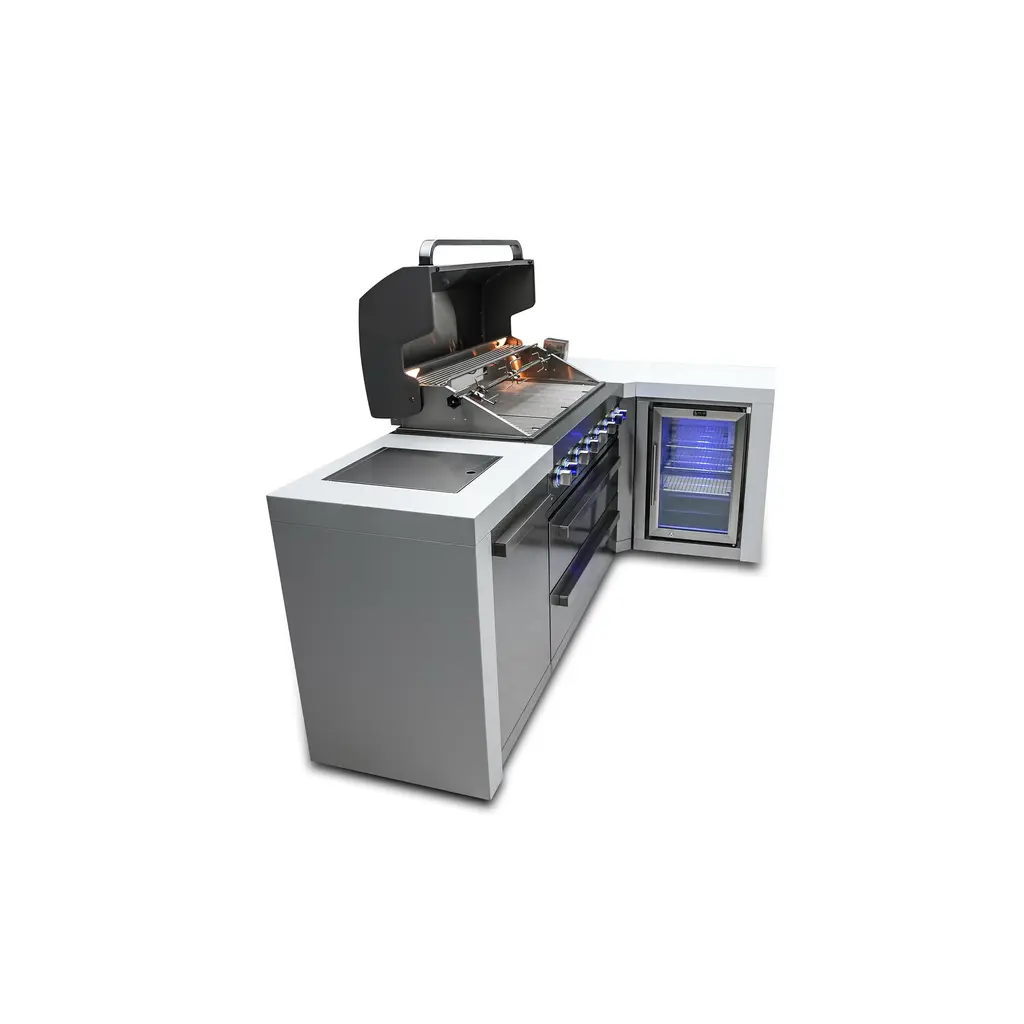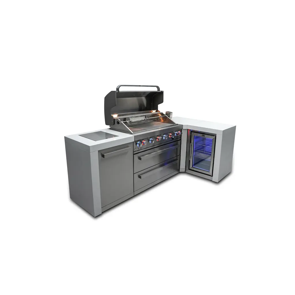 ISLAND FEATURES - The MAi805-D90FC 44-inch island gas grill arrives fully assembled (modular attachment required) and features 6 tubular stainless steel high efficiency burners with a rear height-adjustable ceramic infrared rear burner and a standalone side burner that produce 115,000 BTU’s of heat output. The grill also features a stainless steel warming rack, 8mm stainless steel cooking grids and a generous cooking area of 38-inches x 18-inches (990 square Inches of total cooking area).ADDITIONAL FEATURES - A double lined grill hood with temperature gauge is standard for maximum heat retention. The grill has two cooking surface halogen lights, On/off red/blue changing control knob lights, a bottle opener, electronic ignition, easy access full front pull-out grease tray for easy cleaning, white granite countertops, plus storage drawers and cabinets. Your outdoor kitchen will also come with gliding castor wheels for smooth and easy-to-maneuver movement and increased stability.INCLUDED ACCESSORIES - You will also get a 120V 4-Watt heavy duty electric motor rotisserie kit (holds up to 25 lbs), chopping board, white granite surfaces and waterfall sides, matching 90 degree corner cart with storage shelves, plus a waterproof outdoor rated weather cover to protect your grill from the elements.NATURAL GAS CONVERTIBLE - Although this outdoor grill comes with a propane hose and regulator as it comes ready for propane use, it can be easily set up for conversion into the more environmental-friendly natural gas, providing another convenient cost-effective, and reliable source of heat for outdoor cooking. (Conversion kit sold separately).STAINLESS STEEL CONSTRUCTION - This modular outdoor kitchen is made of 304 marine grade stainless steel, a high-quality material that is known for its durability & resistance to corrosion & rust that also adds sleek, modern, and stylish addition to your backyard or patio. High, consistent heat output are made possible by the stainless steel burners, allowing you to cook a variety of food and meals with ease. The stainless steel components also make the grill easy to clean and maintain.REFRIGERATOR FEATURES - The outdoor rated MAF refrigerator is made with heavy duty 304 stainless steel construction for durability and resistance to the elements. It comes with a stylish glass door for easy viewing of contents and interior blue lighting as well to improve visibility and overall user experience. Additional features include temperature control, adjustable shelves, and a lockable door to secure contents and prevent unauthorized access. Dimensions - 18 1/2” x 17” x 27”LIMITED LIFETIME WARRANTY - Mont Alpi grills are designed and built to last and we stand behind their performance. As a demonstration of commitment to our customers and their satisfaction, we offer a limited lifetime warranty (limitations apply) on all our products. Please do not hesitate to reach out to us If you have any questions or concerns regarding our products. We are here to help.PRODUCT DIMENSIONS - Height (hood closed) - 46” / Height (hood open) - 60” / Countertop Height - 35” / Depth - 50” / Width - 94” / Grill unit - 43”x 23”x 47” / Left Side Burner Unit - 25” x 23” x 35” / Right Side Unit - 25” x 23” x 35” / Rotisserie kit length - 44 1/2”