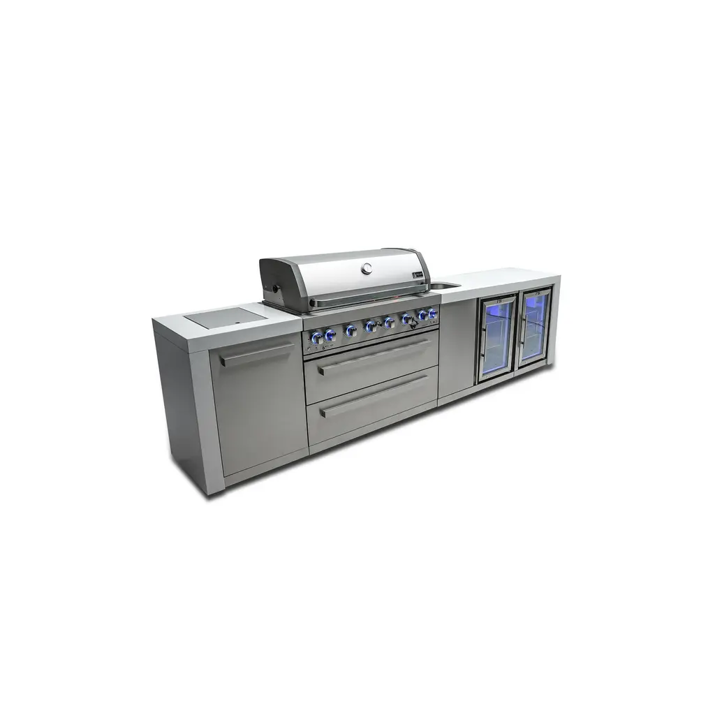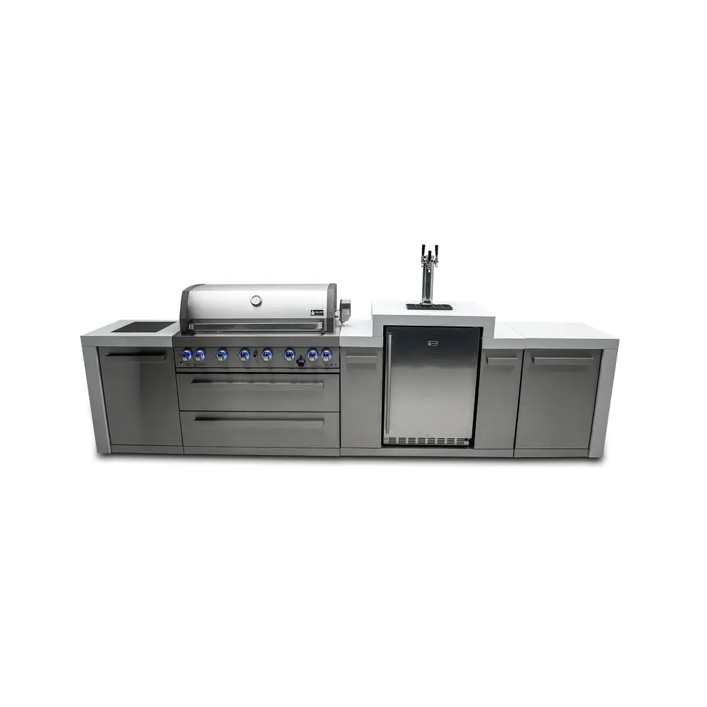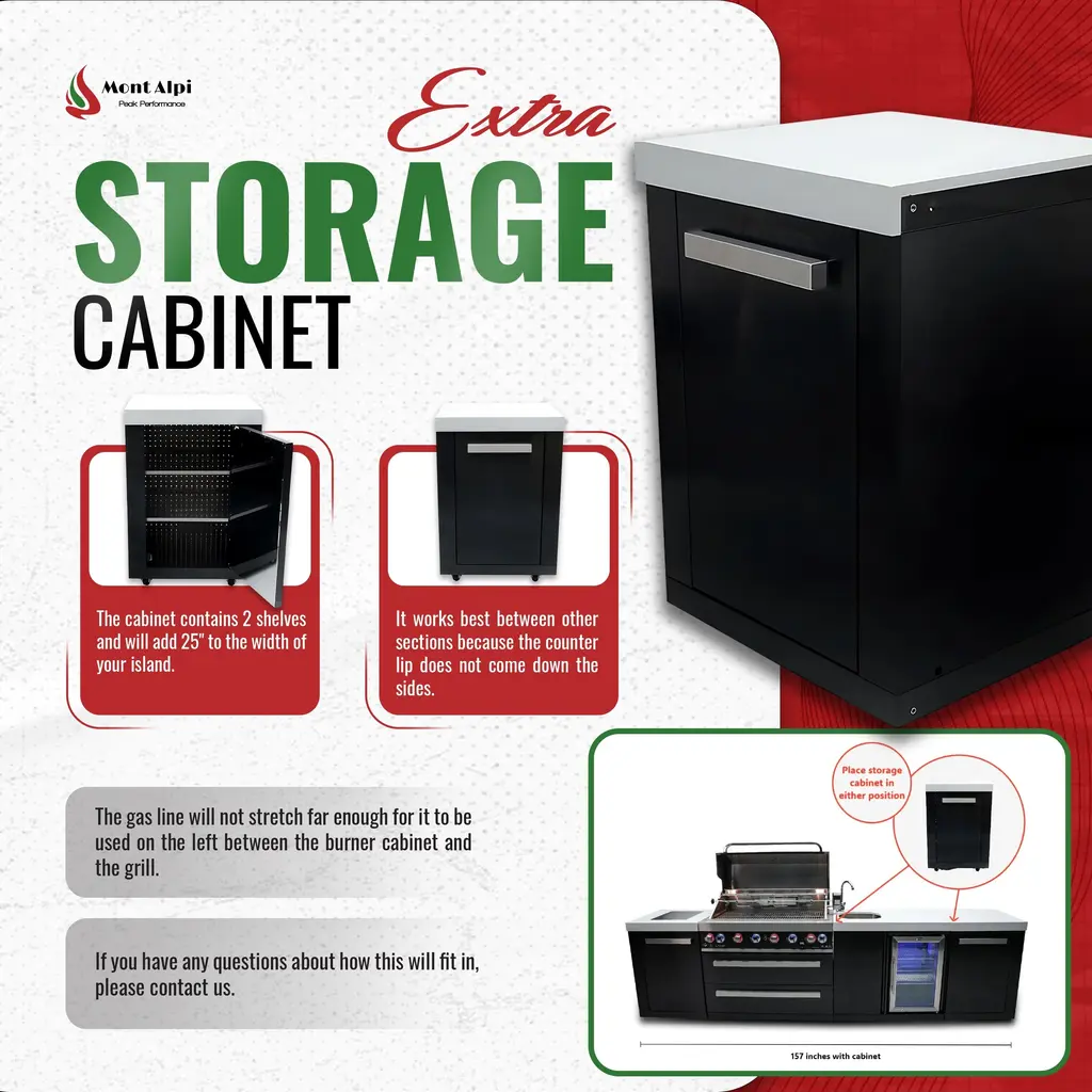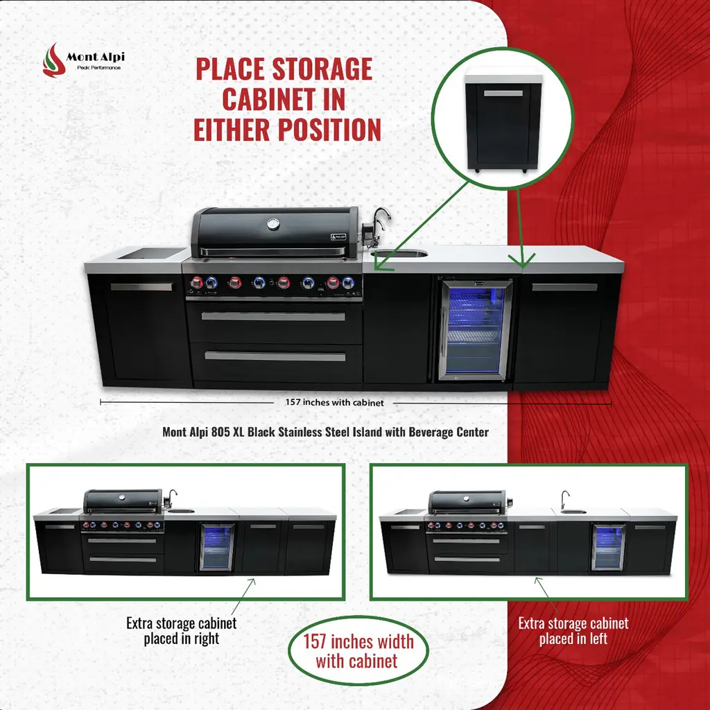 ISLAND FEATURES - The MAi805-DBEV 44-inch island gas grill arrives fully assembled (modular attachment required) and features 6 tubular stainless steel high efficiency burners with a rear height-adjustable ceramic infrared rear burner and a standalone side burner that produce 115,000 BTU’s of heat output. The grill also features a stainless steel warming rack, 8mm stainless steel cooking grids and a generous cooking area of 38-inches x 18-inches (990 square Inches of total cooking area).ADDITIONAL FEATURES - A double lined grill hood with temperature gauge is standard for maximum heat retention. The grill has two cooking surface halogen lights, On/off red/blue changing control knob lights, a bottle opener, electronic ignition, easy access full front pull-out grease tray for easy cleaning, white granite countertops, plus storage drawers and cabinets. Your outdoor kitchen will also come with gliding castor wheels for smooth and easy-to-maneuver movement and increased stability.INCLUDED ACCESSORIES - You will also get a 120V 4-Watt heavy duty electric motor rotisserie kit (holds up to 25 lbs), chopping board, white granite countertop surfaces plus a waterproof outdoor rated weather cover to protect your grill from the elements.NATURAL GAS CONVERTIBLE - Although the MAi805 comes with a propane hose and regulator as it comes ready for propane use, it can be easily set up for conversion into the more environmental-friendly natural gas, providing another convenient cost-effective, and reliable source of heat for outdoor cooking. (Conversion kit sold separately).EXTRA CABINET FEATURES - The Mont Alpi extra storage cabinet adds an additional 25" countertop surface for your grill with a cabinet and additional shelving right under. Please note that this extra storage cabinet can only be added to the right side of the grill. The MA-EXC cannot be added to the left side of the grill due to the gas lines. The gas line is too short to reach through the cabinet to their destination, and also there are no holes to accommodate for them.BEVERAGE CENTER FEATURES - The Mont Alpi beverage center comes the outdoor rated MAF refrigerator standard. This modular attachment also comes with the convenience of a built in faucet and sink making it a sleek and stylish addition to your outdoor kitchen. The beverage center also comes with matching white granite countertop surfaces. Dimensions - 38” x 23” x 35”STAINLESS STEEL CONSTRUCTION - These extra storage cabinets are made of the same 304 marine grade black stainless steel, (and granite) from your Mont Alpi outdoor kitchen. This high-quality material that is known for its durability & resistance to corrosion & rust that also adds sleek, modern, and stylish addition to your backyard or patio.LIMITED LIFETIME WARRANTY - Mont Alpi grills are designed and built to last and we stand behind their performance. As a demonstration of commitment to our customers and their satisfaction, we offer a limited lifetime warranty (limitations apply) on all our products. Please do not hesitate to reach out to us If you have any questions or concerns regarding our products. We are here to help.PRODUCT DIMENSIONS - Height (hood closed) - 46” / Height (hood open) - 60” / Countertop Height - 35” / Depth - 23” / Width - 157” / Grill unit - 43”x 23”x 47” / Left Side Burner Unit - 25” x 23” x 35” / Right Side Unit - 25” x 23” x 35” / Extra Storage Cabinet - 25" / Rotisserie kit length - 44 1/2”
