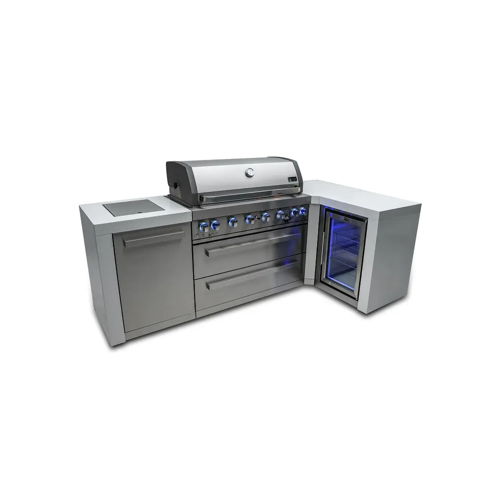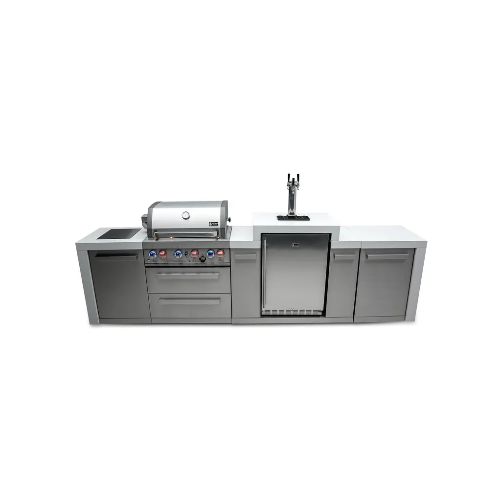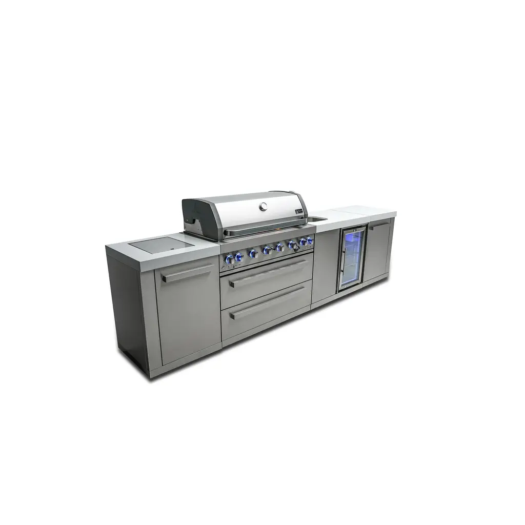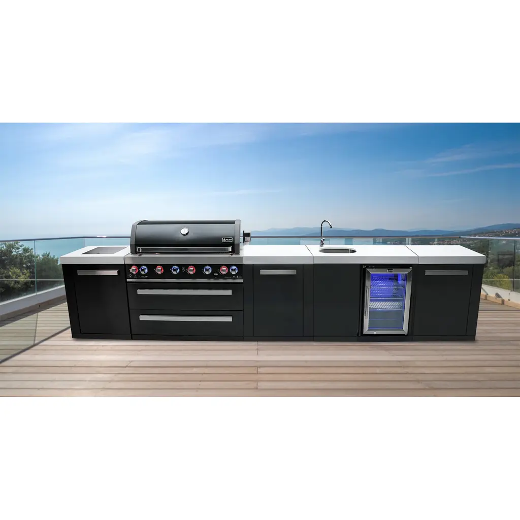 ISLAND FEATURES - The MAi805-DBEV 44-inch island gas grill arrives fully assembled (modular attachment required) and features 6 tubular stainless steel high efficiency burners with a rear height-adjustable ceramic infrared rear burner and a standalone side burner that produce 115,000 BTU’s of heat output. The grill also features a stainless steel warming rack, 8mm stainless steel cooking grids and a generous cooking area of 38-inches x 18-inches (990 square Inches of total cooking area).ADDITIONAL FEATURES - A double lined grill hood with temperature gauge is standard for maximum heat retention. The grill has two cooking surface halogen lights, On/off red/blue changing control knob lights, a bottle opener, electronic ignition, easy access full front pull-out grease tray for easy cleaning, white granite countertops, plus storage drawers and cabinets. Your outdoor kitchen will also come with gliding castor wheels for smooth and easy-to-maneuver movement and increased stability.INCLUDED ACCESSORIES - You will also get a 120V 4-Watt heavy duty electric motor rotisserie kit (holds up to 25 lbs), chopping board, white granite countertop surfaces plus a waterproof outdoor rated weather cover to protect your grill from the elements.NATURAL GAS CONVERTIBLE - Although the MAi805 comes with a propane hose and regulator as it comes ready for propane use, it can be easily set up for conversion into the more environmental-friendly natural gas, providing another convenient cost-effective, and reliable source of heat for outdoor cooking. (Conversion kit sold separately).EXTRA CABINET FEATURES - The Mont Alpi extra storage cabinet adds an additional 25" countertop surface for your grill with a cabinet and additional shelving right under. Please note that this extra storage cabinet can only be added to the right side of the grill. The MA-EXC cannot be added to the left side of the grill due to the gas lines. The gas line is too short to reach through the cabinet to their destination, and also there are no holes to accommodate for them.BEVERAGE CENTER FEATURES - The Mont Alpi beverage center comes the outdoor rated MAF refrigerator standard. This modular attachment also comes with the convenience of a built in faucet and sink making it a sleek and stylish addition to your outdoor kitchen. The beverage center also comes with matching white granite countertop surfaces. Dimensions - 38” x 23” x 35”STAINLESS STEEL CONSTRUCTION - These extra storage cabinets are made of the same 304 marine grade black stainless steel, (and granite) from your Mont Alpi outdoor kitchen. This high-quality material that is known for its durability & resistance to corrosion & rust that also adds sleek, modern, and stylish addition to your backyard or patio.LIMITED LIFETIME WARRANTY - Mont Alpi grills are designed and built to last and we stand behind their performance. As a demonstration of commitment to our customers and their satisfaction, we offer a limited lifetime warranty (limitations apply) on all our products. Please do not hesitate to reach out to us If you have any questions or concerns regarding our products. We are here to help.PRODUCT DIMENSIONS - Height (hood closed) - 46” / Height (hood open) - 60” / Countertop Height - 35” / Depth - 23” / Width - 157” / Grill unit - 43”x 23”x 47” / Left Side Burner Unit - 25” x 23” x 35” / Right Side Unit - 25” x 23” x 35” / Extra Storage Cabinet - 25" / Rotisserie kit length - 44 1/2”