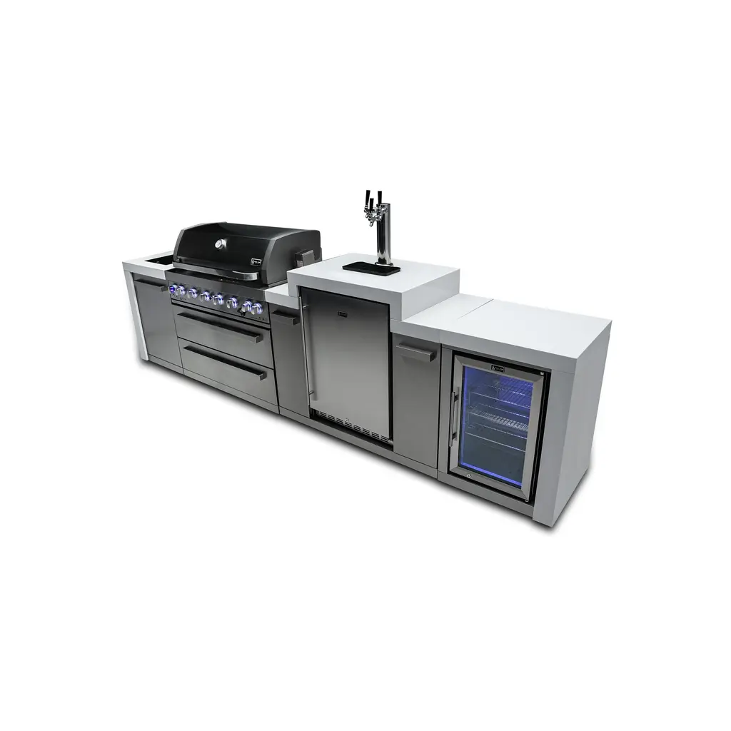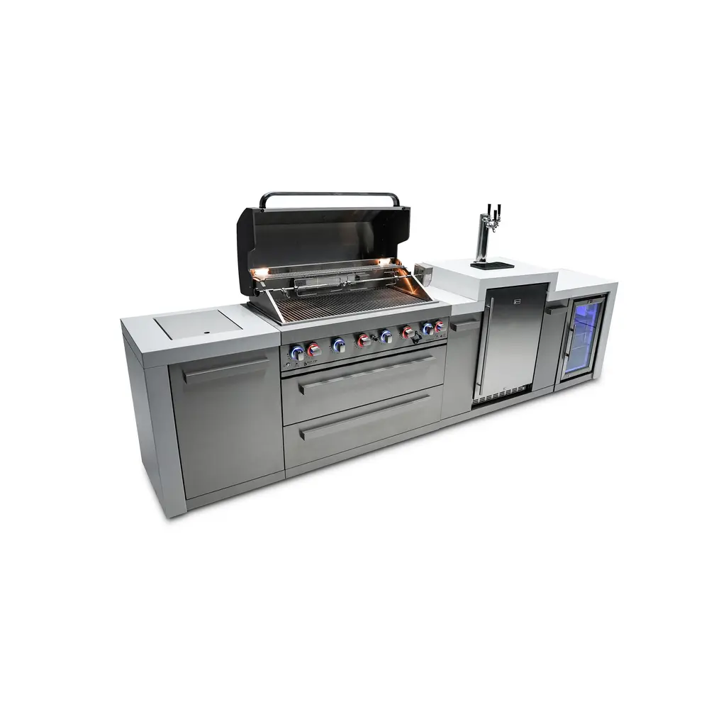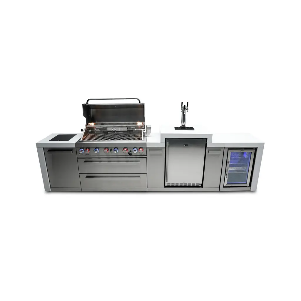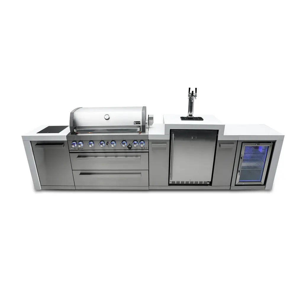 ISLAND FEATURES - The MAi805-DKEGFC 44-inch island gas grill arrives almost fully assembled (modular attachment required) and features 6 tubular stainless steel high efficiency burners with a rear height-adjustable ceramic infrared rear burner and a standalone side burner that produce 115,000 BTU’s of heat output. The grill also features a stainless steel warming rack, 8mm stainless steel cooking grids and a generous cooking area of 38-inches x 18-inches (990 square Inches of total cooking area).ADDITIONAL FEATURES - A double lined grill hood with temperature gauge is standard for maximum heat retention. The grill has two cooking surface lights, On/off red/blue changing control knob lights, a bottle opener, electronic ignition, easy access full front pull-out grease tray for easy cleaning, white granite countertops, plus storage drawers and cabinets. Your outdoor kitchen will also come with gliding castor wheels for smooth and easy-to-maneuver movement and increased stability.INCLUDED ACCESSORIES - You will also get a 120V 4-Watt heavy duty electric motor rotisserie kit (holds up to 25 lbs), chopping board, white granite surfaces and waterfall sides, plus a water resistant outdoor rated weather cover to protect your grill from the elements.NATURAL GAS CONVERTIBLE - Although this outdoor grill comes with a propane hose and regulator as it comes ready for propane use, it can be easily set up into the more environmental-friendly natural gas, providing another convenient cost-effective, and reliable source of heat for outdoor cooking. (Sold separately).STAINLESS STEEL CONSTRUCTION - This modular outdoor kitchen is made of 304 marine grade stainless steel, a high-quality material that is known for its durability & resistance to corrosion & rust that also adds sleek, modern, and stylish addition to your backyard or patio. High, consistent heat output are made possible by the stainless steel burners, allowing you to cook a variety of food and meals with ease. The stainless steel components also make the grill easy to clean and maintain.KEGERATOR FEATURES - The Mont Alpi triple tap beer keg dispenser refrigerator with digital display allows for extra precision on temperature control for any environment. Included is a ball valve with male and female thread that makes soft drinks, seltzers and other beverages a possibility. The Mont Alpi keg center can accommodate a variety of different types and sizes of kegs (up to 3 slim kegs) allowing for the storage and dispensing of a wide range of beverages. Dimensions - 48” x 23” x 35”REFRIGERATOR FEATURES - The outdoor rated MAF refrigerator is made with heavy duty 304 stainless steel construction for durability and resistance to the elements. It comes with a stylish glass door for easy viewing of contents and interior blue LED lighting as well to improve visibility and overall user experience. Additional features include temperature control, adjustable.LIMITED LIFETIME WARRANTY - Mont Alpi grills are designed and built to last and we stand behind their performance. As a demonstration of commitment to our customers and their satisfaction, we offer a limited lifetime warranty (limitations apply) on all our products. Please do not hesitate to reach out to us If you have any questions or concerns regarding our products. We are here to help.PRODUCT DIMENSIONS - Height (hood closed) - 46” / Height (hood open) - 60” / Countertop Height - 35” / Depth - 23” / Width - 142” / Grill unit - 43”x 23”x 47” / Left Side Burner Unit - 25” x 23” x 35” / Right Side Unit - 25” x 23” x 35” / Rotisserie kit length - 44 1/2”