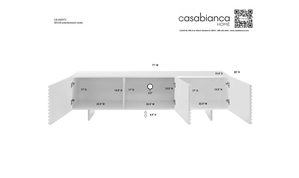 The Moon entertainment center in high gloss with storage by Jennifer Casa provides both versatile style and comfort with an ultra-modern that can easily be integrated into your current room decor. This Moon entertainment center features three soft-close cabinets adding elegance with functionality to your space. Our Casabianca Home Moon entertainment center is manufactured using quality materials that will last for many years to come and is backed by our 1 Year limited warranty against manufacturer defects. Dimensions : 71" W x 19.5" D x 20" H Weight: 133 lbs Features : Moon entertainment center in white high gloss with storage Made using high-quality materials that will last for many years to come Quality that will last for many years to come and is backed by our 1 Year limited warranty against manufacturer defects This Moon entertainment center features three soft-close cabinets adding elegance with functionality to your space Product Care: Casegoods (C): Dust with a soft, dry cloth. All spills should be cleaned up immediately. Use glass cleaners on glass only. DO NOT use any abrasive cleaning supplies.