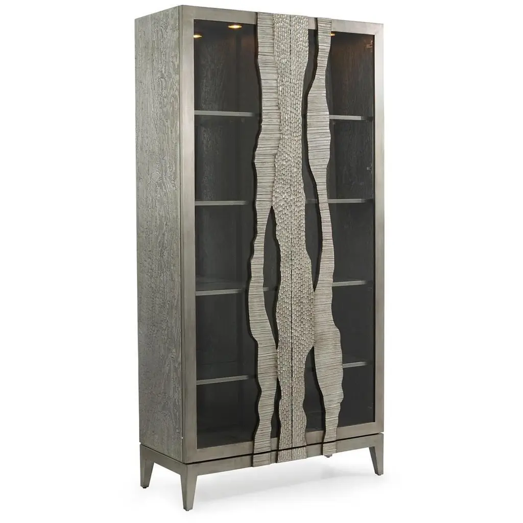 The Moon Shadow Display Cabinet is a gorgeous statement piece that exudes opulent style. The stunning frame of oak and maple wood features a fluted pattern in a Silver White finish. Beautiful steel handles showcase an organic pattern in Valyrian Gold over églomisé, complementing the golden plinth base. This elegant design statement features dimmable lighting and a single interior compartment with four adjustable shelves,