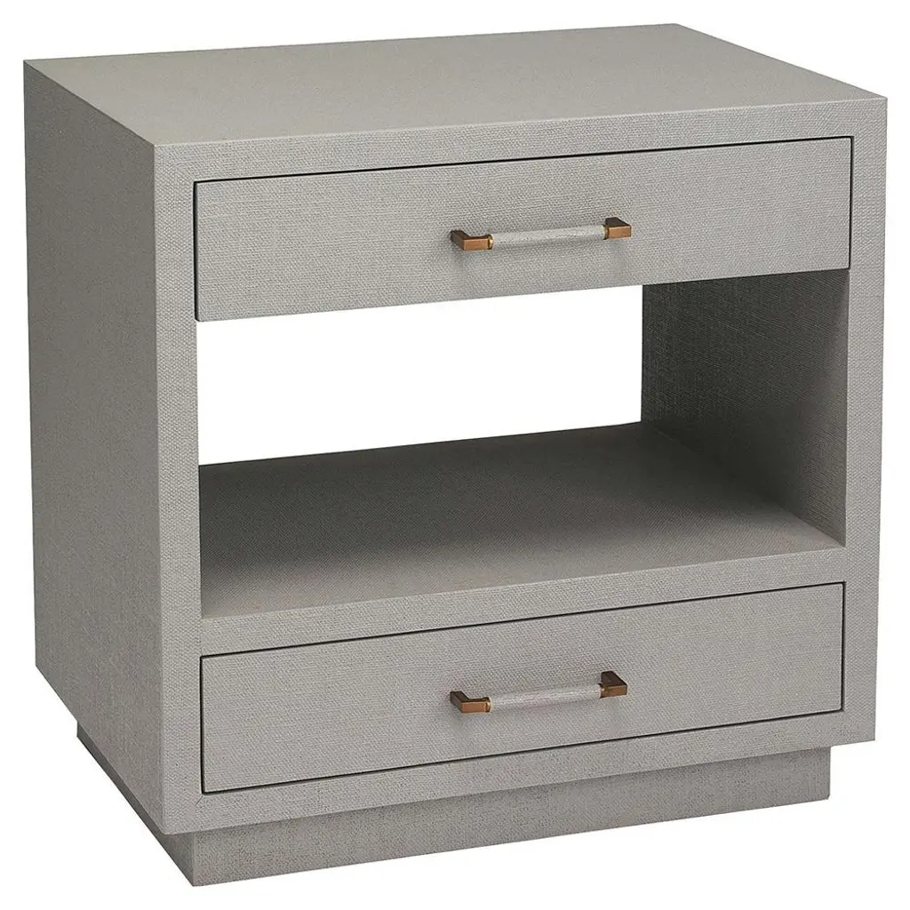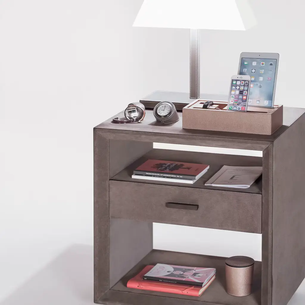 Clean-lined, chic and versatile. This small cabinet boasts an open frame fully wrapped in soft beige suede that will add instant sophistication to any room. Perfect as an occasional table in a hallway, a bedside table in the bedroom, or side table in the living room, the drawer has a linear bronze handle and is equipped with a soft-closing system and removable suede lining. Customization in other sizes is available on request.