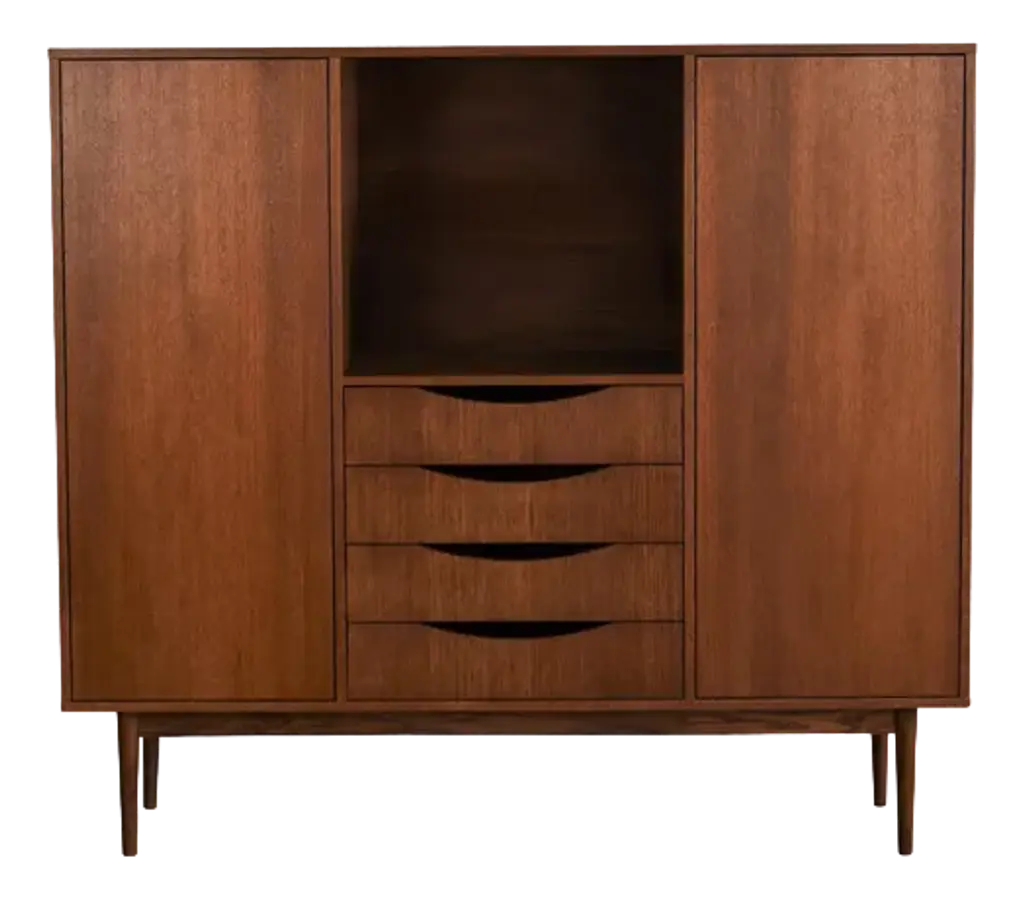 Moran Highboard by PastformDimensions: D 40 x W 165 x H 150 cmMaterials: Stained and varnished wood.Available in different wood color finishes: Whiskey, Rum, BPA, Nobel, Brandy, Schwarz, Natura, Dunkelbraun, Honig, Nevada, and Cognac. Please contact us.Rooted in a good traditionThe Pastform Furniture studio dates back to the 1990s. Having in mind the idea of a traditional family company, Dawid Gełeta established a carpenter’s shop in 1997. The company specializes in the manual production of utility furniture. Times have changed and with them, fashion has changed. In 2016 we decided to change the direction, following the growing demand for vintage furniture.My name is Mateusz Gełeta, I am the son of the carpenter who founded the company. From an early age, I have watched my dad’s work. He put his whole heart into creating furniture, polishing every detail with his strong hands and making sure that nothing escaped our attention before sending the product to the customer. He made sure that every piece of furniture was perfect and refined. We remain true to these principles.Following the blow, I decided to create a harmonious combination of modern quality with the classic style of the 1960s. This is why I designed and created a unique collection of wonderful furniture, which, in addition to its well-thought-out functionality, also creates a perfect design and composes original arrangements.The golden age of interior designIn the 1960s interiors used to take on a very characteristic touch. All over the world, this style was called a mid-century modern, locally it was simply – retro furniture. Simple, elegant minimalistic form, without unnecessary decorations and splendor. Decorating with the idea of an uncomplicated composition, it allows for an undisturbed selection of the arrangement accessories and emphasizes a high level of functional comfort. One might say – a perfect piece of furniture. Comfortable, hiding surprisingly many items despite quite neat dimensions, made of noble species of wood and created by hand, with a focus on carefully refined details. No wonder its popularity is growing so much.Unique, refined, with a soulEach piece of the Pastform collection represents a unique style. Thoughtful concept of usable comfort, refined details, carefully selected raw materials, and proven accessories. We use only high-quality boards which we veneer with oak, American walnut, and other durable wood species. They are carefully oiled with the best, hard, ecological oil waxes, giving the furniture its final shape. This technology brings out the natural beauty of wood, exposes the grain and unique design of each piece, highlights the beautiful color, and allows to achieve timeless durability.This is how unique, thoughtful, and refined furniture with a soul is created.Thinking about futureWe are trying to positively create the world of which we are a part, contributing to a better tomorrow. We cooperate with local suppliers, support small companies and production plants, care for ecology, and respect the needs of the land. We always strive to establish long-lasting, based-on-trust relationships with customers and contractors.Flexible, with openness and heart on handWe sincerely like what we do. Playing with the shape, structure, and texture of wood is fascinating. Creating new arrangements and coming up with innovations that will meet your expectations. We are proud of our products and we are happy to present you with our collection of refined furniture.All our vintage furniture can be made on request – fulfilling the boldest dreams and fantasies. See our offer and if you want to know more, feel free to contact us. We are waiting for you!