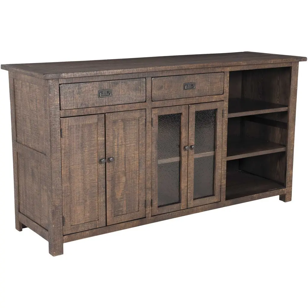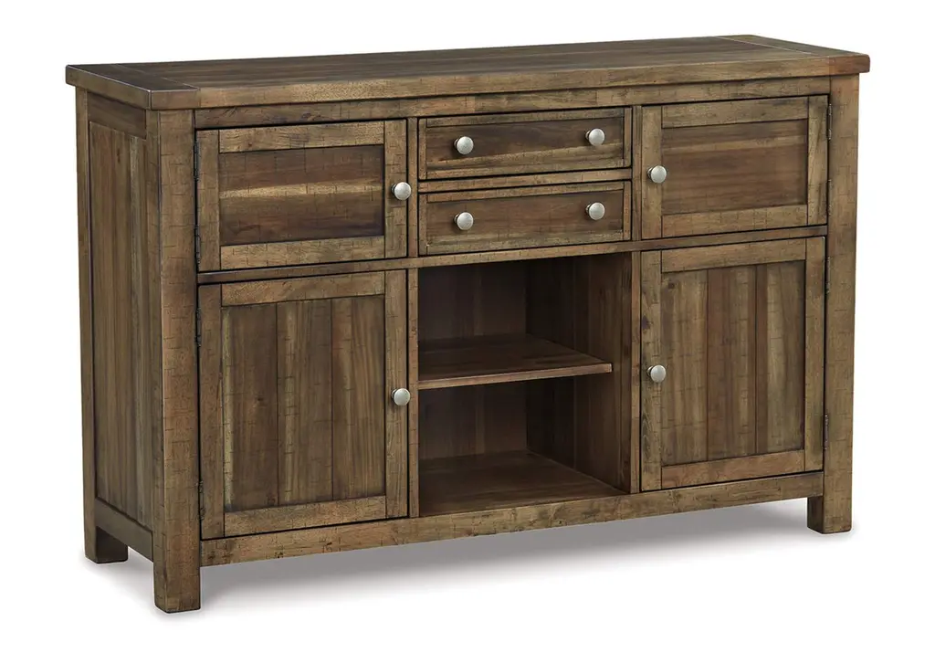 This dining room server might be simple at first sight, but a closer look reveals beauty in the details. With the plank-effect cabinet doors and table top, distressed nutmeg finish and antiqued bronze-tone hardware, it's simply beaming with charm. Stylish server offers abundant storage and even provides display space in the form of two open shelves. - Product Details provided by Manufacturer, Slumberland not responsible for errors in information.