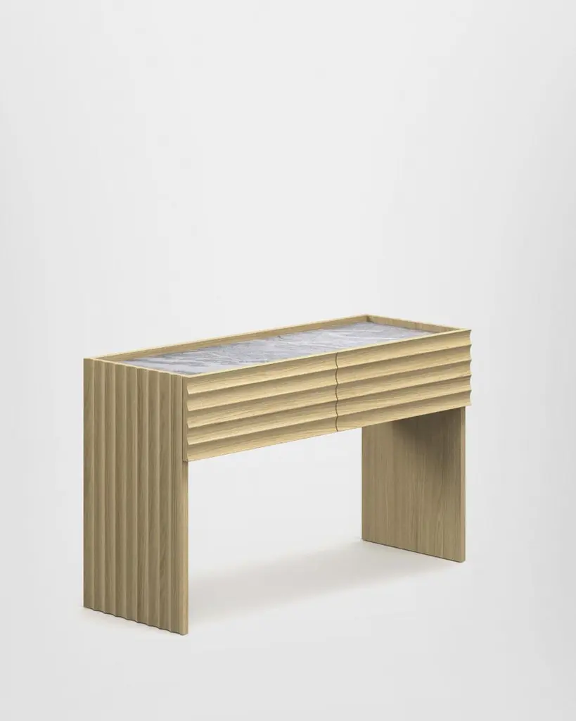 With linear forms and clear-cut symmetries, the Rows collection by Patricia Urquiola is geometrical and minimalist, expressing a refined artistic concept. Doors, side panels and table bases are both formal and decorative. The curved milled edge running the length of the surface is inspired by the nature morte of Amédée Ozenfant, a French writer and painter who founded the Purism movement.The storage series comprises four types of units, including two sideboards, a cabinet and a console table with drawers, designed for the dining and living space. The units are made from particleboard with an oak veneer finish, applied using a membrane press – a process that preserves the continuity of the grain and gives the furniture an artisanal feel, without hiding the industrial method of production.Different tops and finishes options available, please inquire with us.DIMENSIONS:W. 120 x D. 45 x H. 72 cmAvailable in different options, price upon request.