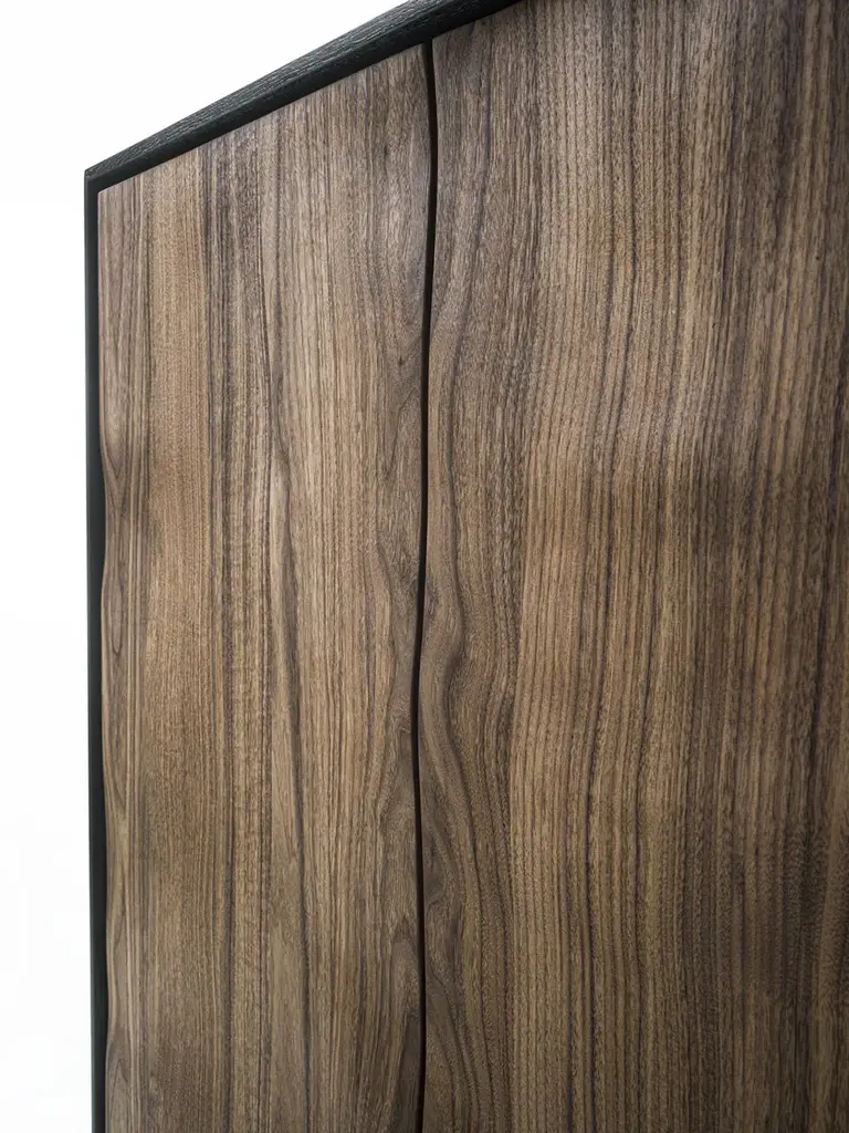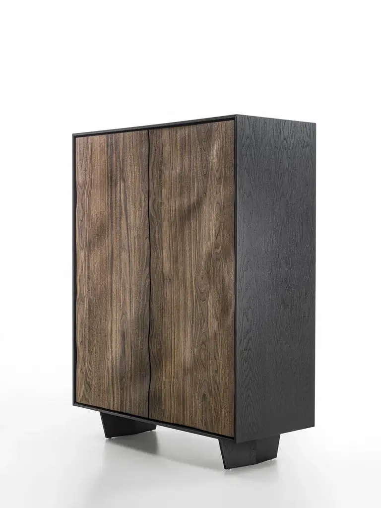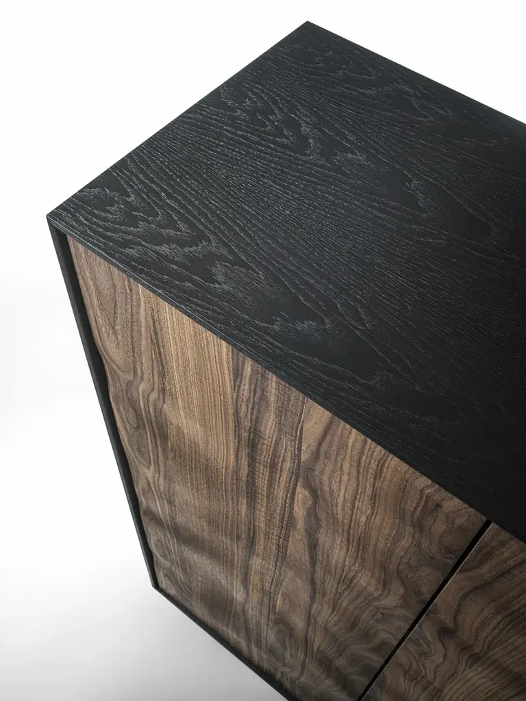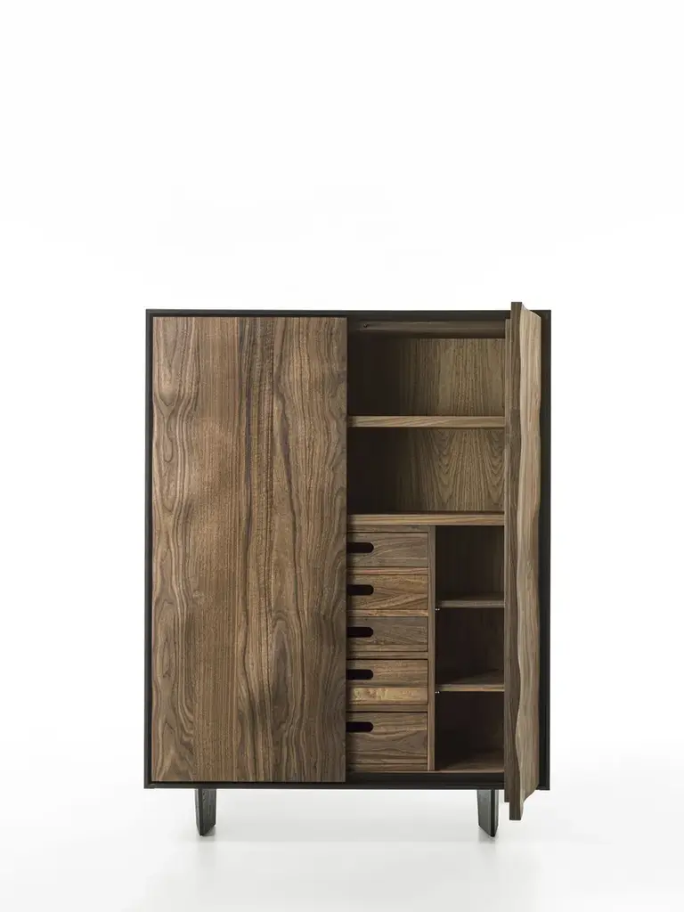 Move High is a highboard in solid wood and blockboard highboard with a wooden frame. Shelves and drawers assembled with traditional dovetail joints inside, with a grooved handle. The unique processing technique applied to the doors and the front of the drawers creates a sculptural effect through the extroflection of the wood, endowing it with a sinuous movement.