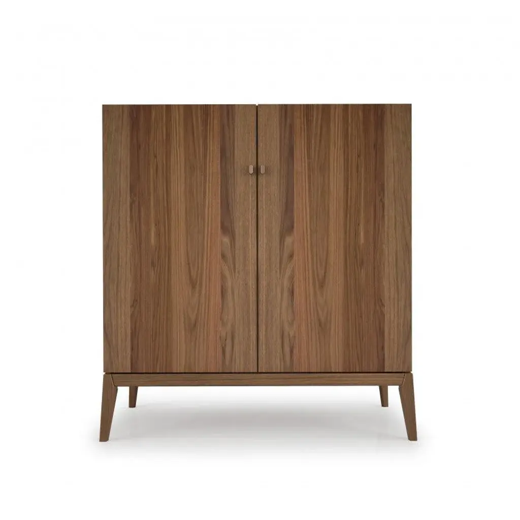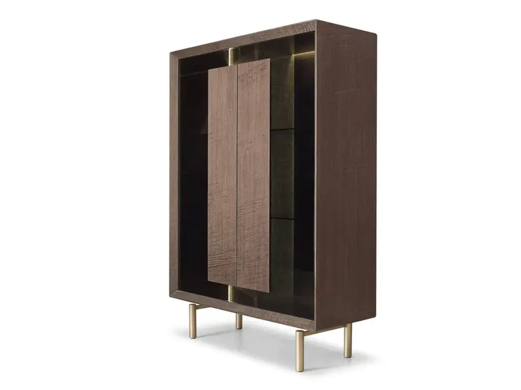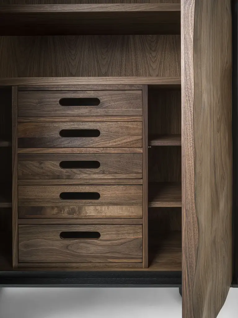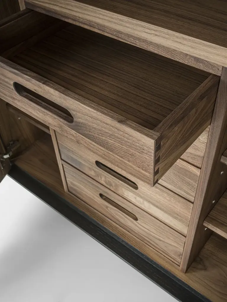 Move High is a highboard in solid wood and blockboard highboard with a wooden frame. Shelves and drawers assembled with traditional dovetail joints inside, with a grooved handle. The unique processing technique applied to the doors and the front of the drawers creates a sculptural effect through the extroflection of the wood, endowing it with a sinuous movement.