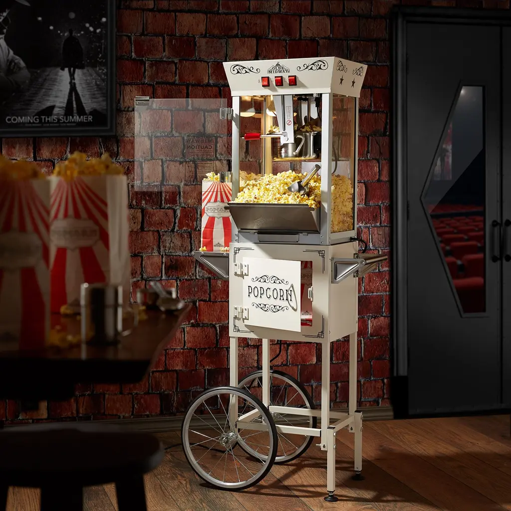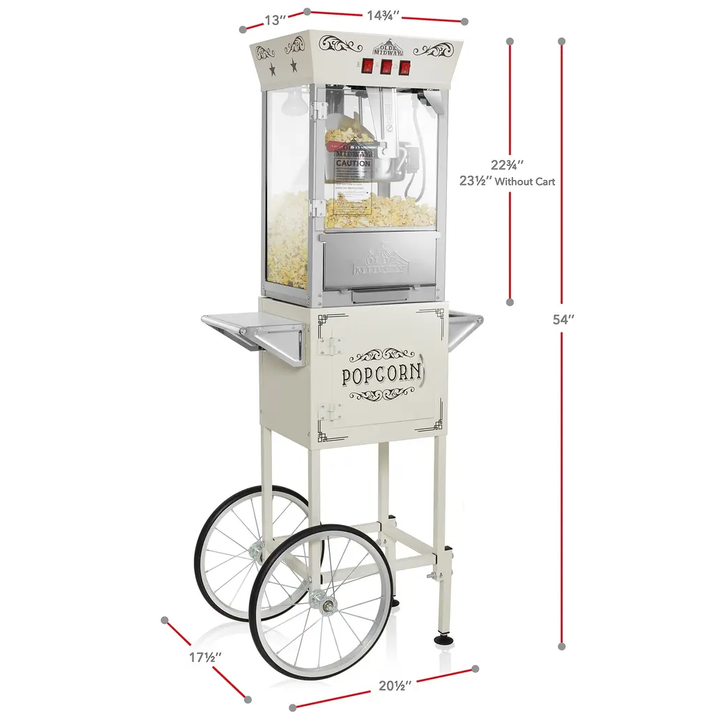 Popcorn machine with cart: Olde Midway's popcorn machine on wheels features an antique-style design with modern features. The popcorn cart features 16" bicycle-style wheels and a cabinet with space for popcorn supplies. The large 8-ounce stainless steel kettle makes about 3 gallons of popcorn per batch. This popcorn maker ideal for home theaters, businesses, school events, parties, and more.High-quality popcorn machine: This popcorn machine with cart is built to last. It is constructed of highly durable materials, including heavy-duty powder-coated steel and stainless steel food zones. Enjoy continuous popcorn popping with the commercial-quality, 850-watt machine with whisper quiet motor. Overall Dimensions: 20-1/2" W x 17-1/2" D x 54" H.Tempered safety glass: The glass windows and door provide protection, sturdiness, and a clear view of the popcorn-popping magic. The tempered safety glass resists breakage, scratching, and hot temperatures.Easy-to-use: A simple, 3-switch design makes popping fast and simple. The switches operate the heat light warmer, stirrer, and kettle heater. The built-in warming deck and interior heat light are just like professional-grade popcorn machines, keeping popcorn warm and fresh. A reject kernel tray is also included for any unpopped kernels (old maid's), ensuring every batch is served up perfectly.Popcorn supplies included: This movie theater popcorn machine includes stainless steel serving supplies and 50 popcorn bags. The stainless steel accessories include a 1/2 cup measuring cup, tablespoon, popcorn scoop, and salt shaker. Enjoy making gourmet, movie theater-style popcorn anywhere with Olde Midway's popcorn machine with cart. Offering nostalgic charm with a vintage design, this 850-watt popcorn machine has a powerful whisper quiet motor and completely modernized features for convenient, easy operation, and lasting functionality. The 8-ounce kettle can produce about 3 gallons of popcorn per batch to satisfy large crowds. Olde Midway's popcorn machine with 8 oz kettle is ideal for adding novelty in home movie theaters and office breakrooms. The popcorn cart is designed with bicycle-style wheels for mobility and a storage cabinet with ample storage for popcorn supplies. Enjoy popcorn at game nights, school carnivals, little league games, and more. It also makes a great gift for movie buffs. This deluxe popcorn machine is constructed of highly durable materials, including heavy-duty powder-coated steel and stainless steel food zones, tempered safety glass walls, vibrant premium paint, and a commercial-quality motor. A convenient 3-switch operation includes a heat light warmer, stirrer, and kettle heater. This popcorn popper includes a warming deck and heat light to keep popcorn fresh and delicious. It also includes a drawer to catch any unpopped kernels for a perfectly popped batch every time. Cleans easily with water. Runs on a US-standard 120 volt power cord for quick and easy setup almost anywhere. Includes: Olde Midway Popcorn Machine with 8 oz Kettle Popcorn Cart with Wheels Stainless Steel Supplies: 1/2 cup Measuring Cup, Tablespoon, Popcorn Scoop, and Salt Shaker (50) Popcorn Bags Dimensions: 20-1/2" W x 17-1/2" D x 54" H Minor assembly is required. Popcorn machine can be used with and without the cart.