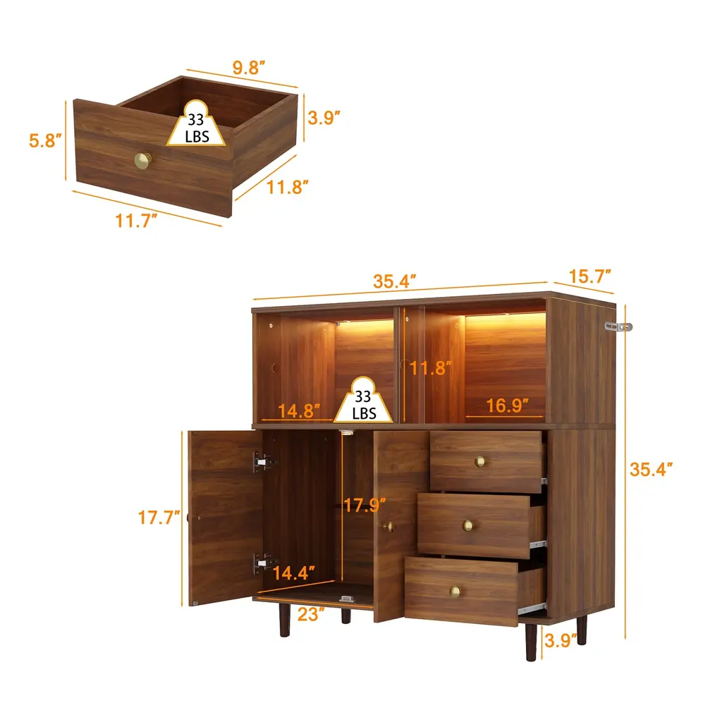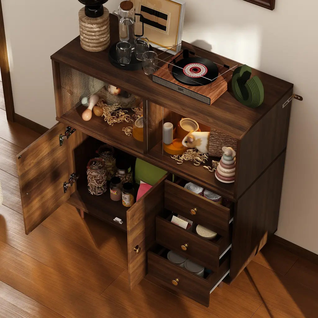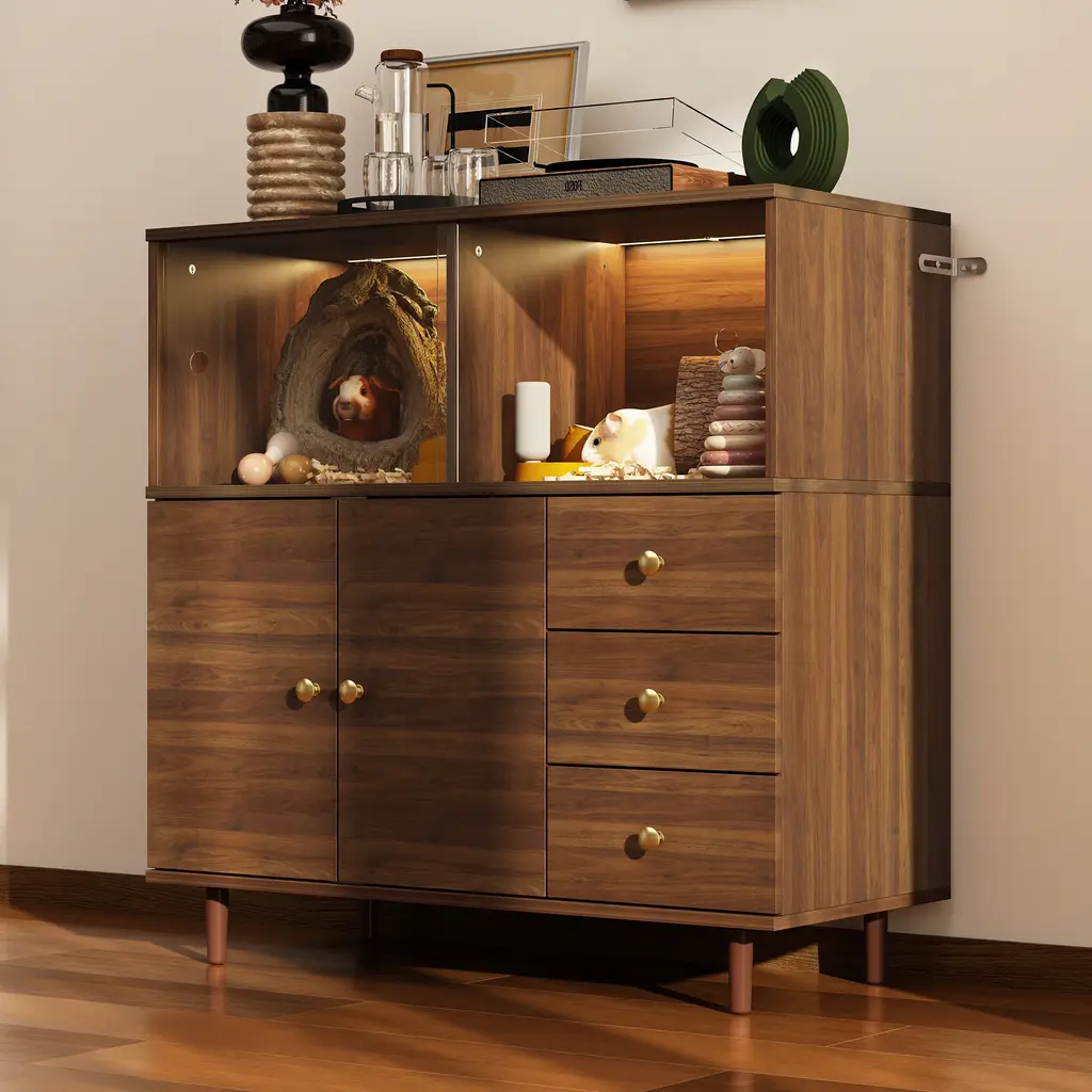 A stylish and functional fusion of pet care and home storage, this cabinet doubles as both a hamster habitat and a display bookshelf. Crafted with smooth sliding acrylic doors, it allows for easy interaction and viewing of your small pets while keeping them secure. The built-in LED strip lighting features three color settings to suit any ambiance. Equipped with three smooth-gliding drawers and two cabinet doors, it provides ample storage for pet supplies, books, or household items. A perfect blend of practicality and aesthetic, this piece adds charm and organization to any room.