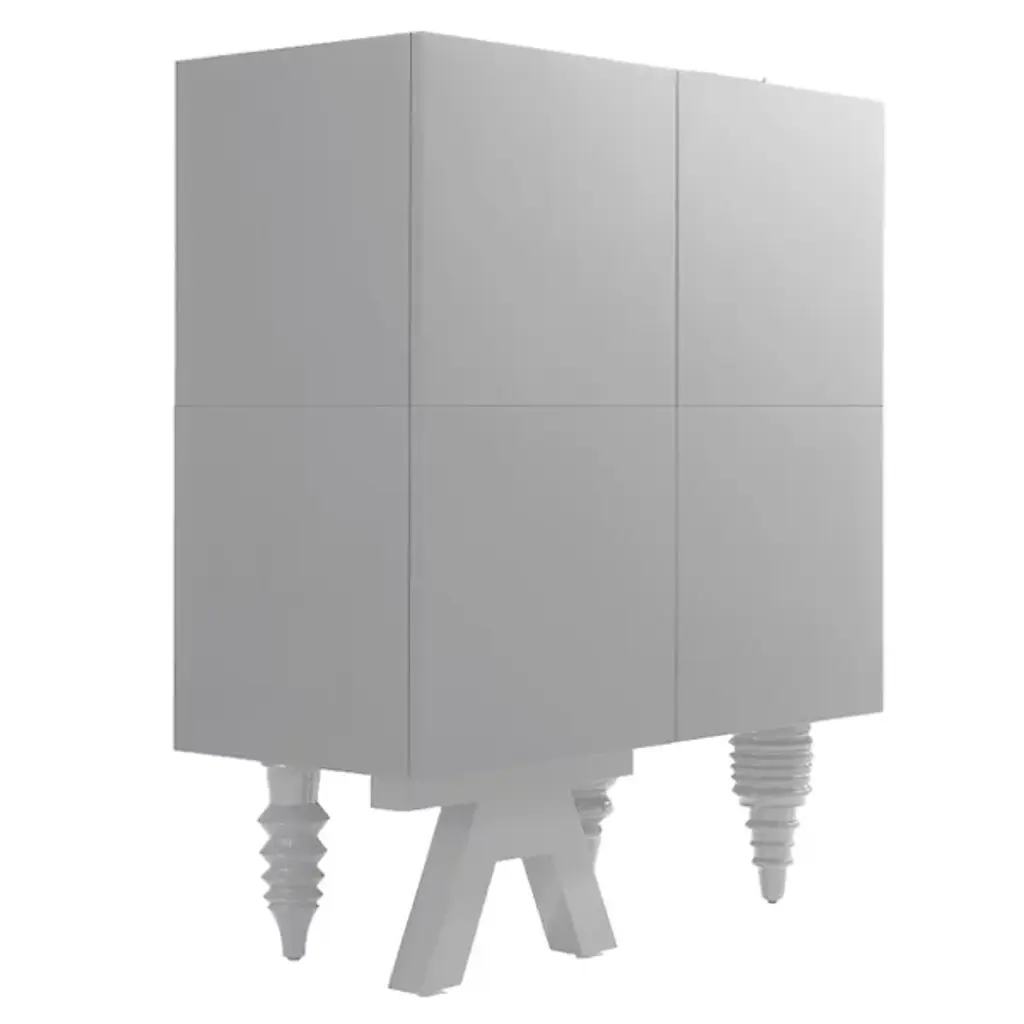 The Multileg Cabinet 2 from BD Barcelona provides an engaging, playful accompaniment to home décor and storage needs. Designed by Jamie Hayon and developed in only a few weeks for the 2006 Milano Furniture Fair as part of the Showtime Collection, its complete success and stunning surfaces keep it vibrant and vital for years to come. The single split-leg base below the cabinet is nicely contrasted by spiral legs for an offset, jubilant character, while the cabinet’s geometrically shaped face features clean lines for a grid-like appearance. Its top is composed of painted glass, with solid alder wood and MDF comprising the rest; its structural elements contrast organic irregularity with an orderly upper housing, calling attention to Spanish design and clever craft.
