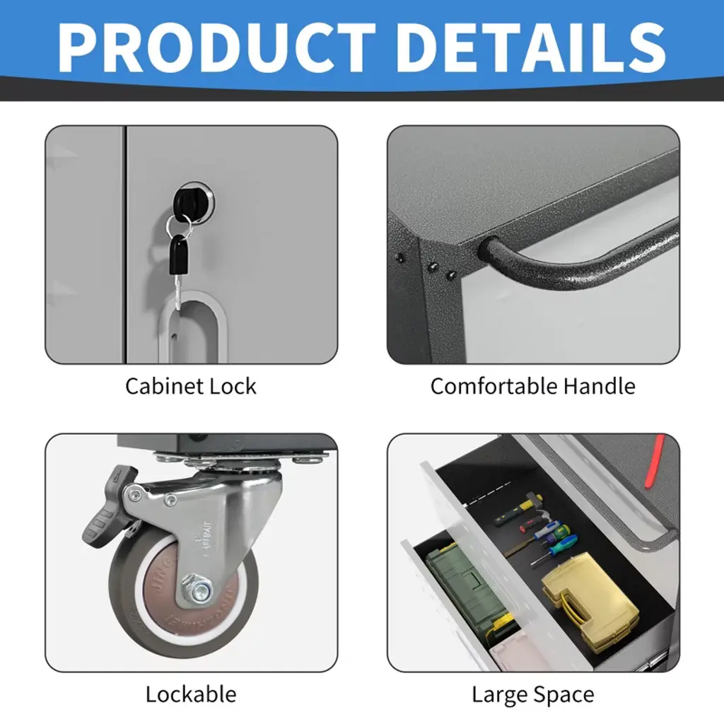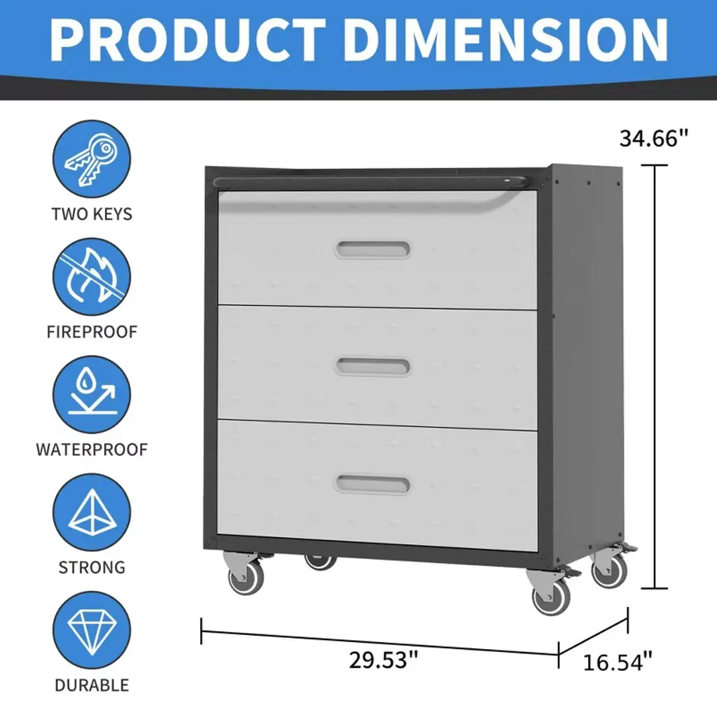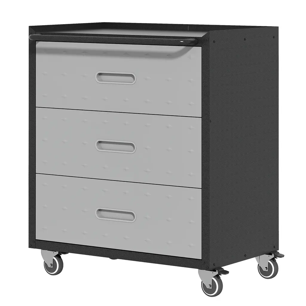 This Munora rolling tool cabinet combines durability, mobility, and versatile storage for garage or workshop environments. The black/grey steel unit (16.54"D x 29.53"W x 34.65"H) features 18-gauge cold-rolled steel construction with a dual-tone powder-coated finish, passing 1000-hour salt spray tests for rust resistance. Four swivel casters (two lockable) with silent rubber wheels enable smooth movement, while three full-extension drawers (with ball-bearing slides) secure tools and supplies. The raised-top workbench design prevents tools from sliding off, and the ergonomic drawer handles enhance usability. Assembly takes 30 minutes with the included wrench, and the unit ships with a 1-year warranty for peace of mind.