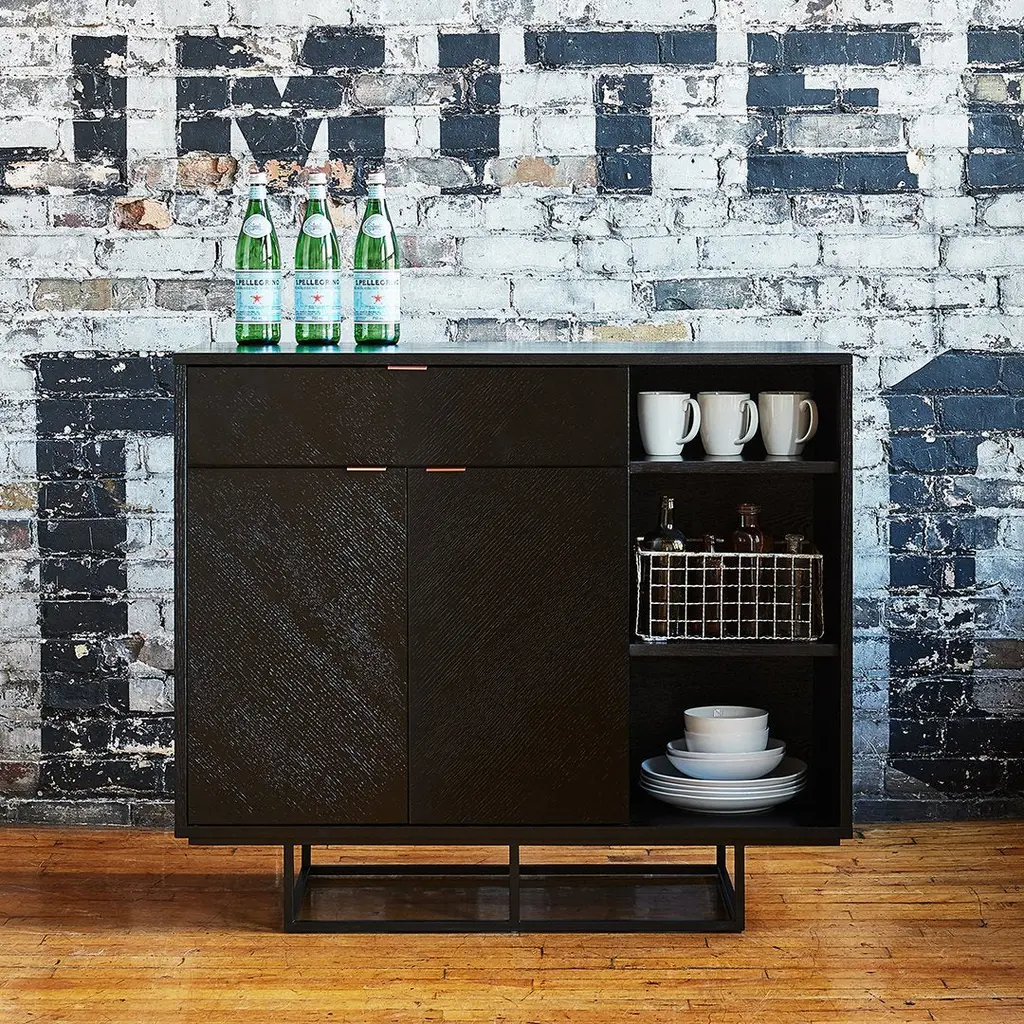 The Myles Cabinet combines subtle details and craftsmanship to create a storage design that exudes simple sophistication. Rose gold handles contrast dark stained, chevron-patterned oak faces. A recessed, slender steel base with black, powder-coated finish creates an illusion of weightlessness. Adjustable shelves in the interior compartments and open storage area provide plenty of efficient storage space allowing this design to maximize functionality in a smaller and taller footprint. Part of the Myles Storage Series, this table matches perfectly with the Myles Media Stand, End Table and Credenza.