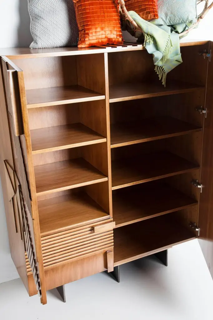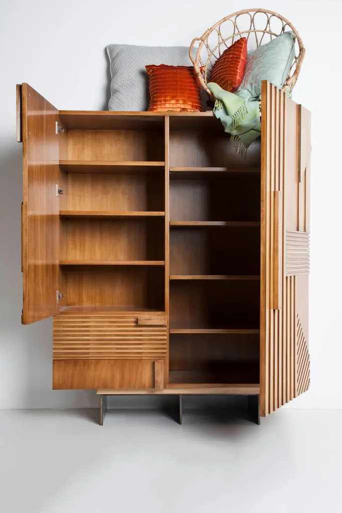 Mytho Wooden Cabinet by Lola GlamourDimensions: D 45 x W 120 x H 160 cmMaterials: Wood.A bet on ingenuity. A set of wooden pieces with different thicknesses glides across its surface in a double three-dimensional effect. The irreverent, but elegant display of vertical, horizontal, and oblique lines is reinforced by the spontaneous attitude of the overlapping of the pieces. Completely finished in natural, with a black lacquered iron base.Two doors, one with three shelves and the other with four, as well as two drawers.We are Félix and Désirée Ramos, brothers and product designers of our brand, Lola Glamour.We are interested in the singular, the different, the beauty, and the balance of color and materials. We have the ability to observe and the ability to translate any beautiful object into a piece of furniture.We are proud of having created our own style, a way of understanding design, which allows us to tell stories and connect with the souls of people and spaces.Lola Glamor is a Spanish company from Soria, which has designed and manufactured unique furniture in noble woods, with artisanal construction and extraordinary finishes since 1995. Artistic furniture that is customized in size and finish according to the client's needs.We offer original furnishing solutions for professionals and individuals from any country in the world, mixing materials, volumes, motifs, and colors that achieve their own style.We are, above all, the sum of a team of people who contribute their dedication and commitment to a unique level of demand, detail, and quality.
