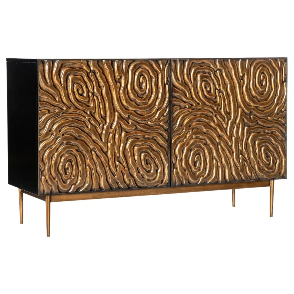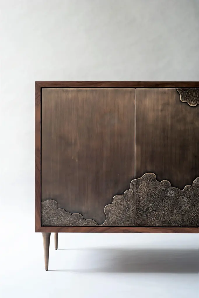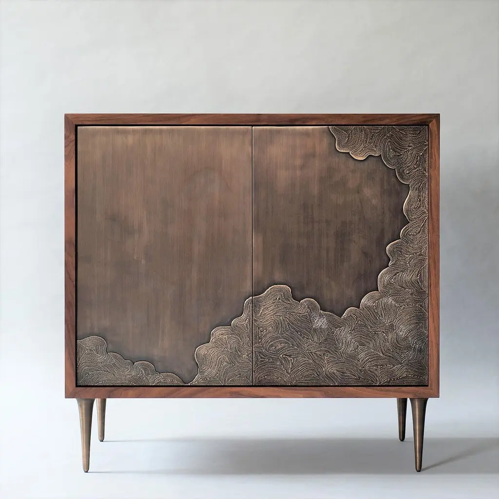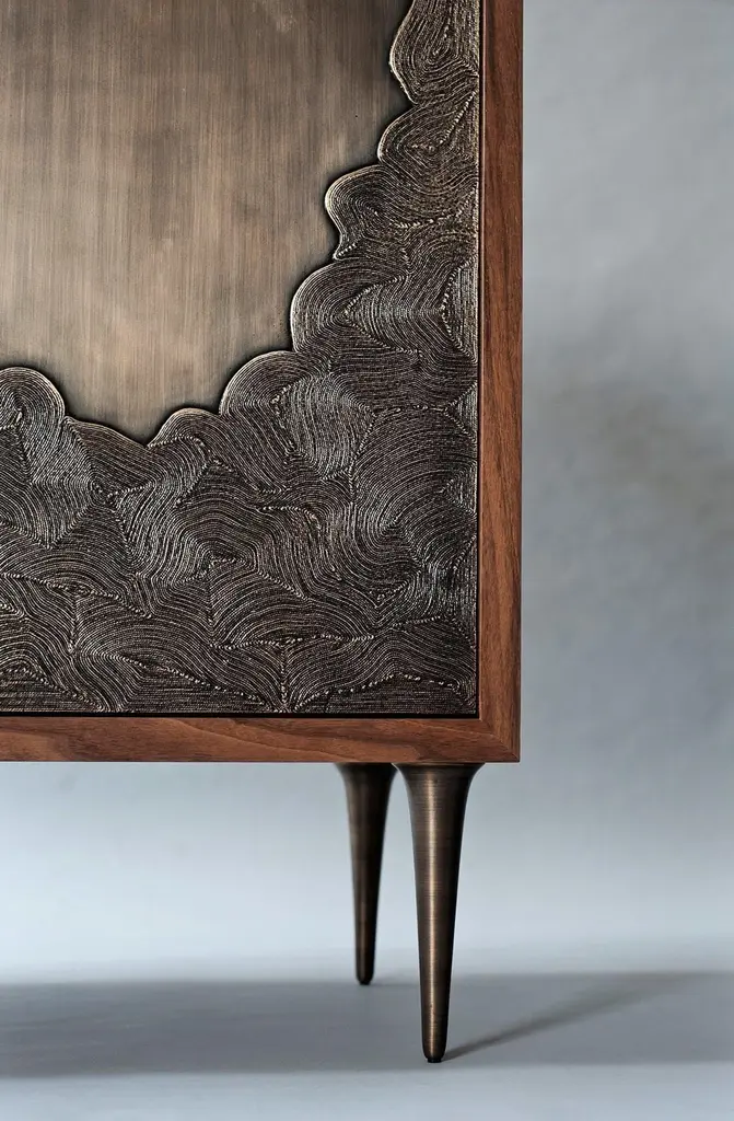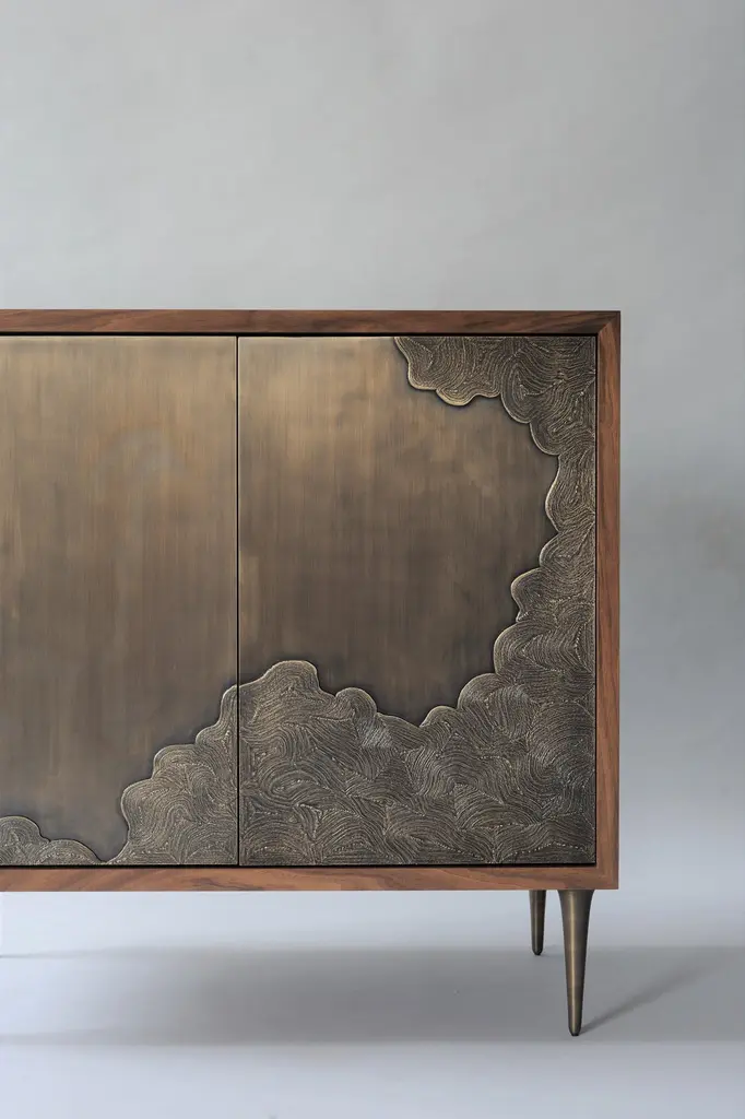 Named after the Japanese word for wave, the Nami Collection showcases bronzework in the form of swelling surf. The two-door cabinet’s richly textured, push-to-open fronts were cast using coiled thread—a nod to the ancient Dhokra creations of nomadic Indian artisans. Fine millwork and solid metal legs add a quiet counterpoint to the bold design.