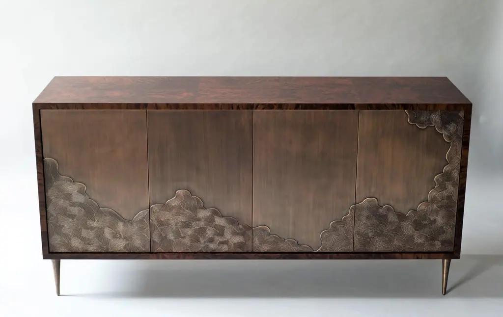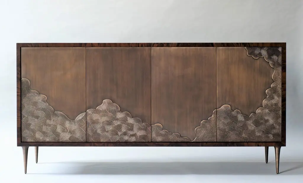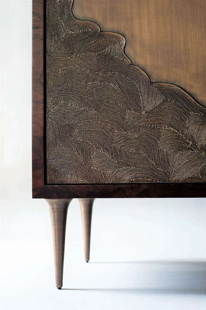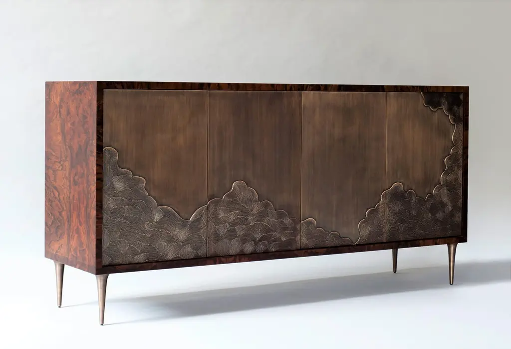 Named after the Japanese word for wave, the Nami Collection showcases bronzework in the form of swelling surf. The four-door cabinet’s richly textured, push-to-open fronts were cast using coiled thread—a nod to the ancient Dhokra creations of nomadic Indian artisans. Fine millwork and solid metal legs add a quiet counterpoint to the bold design.