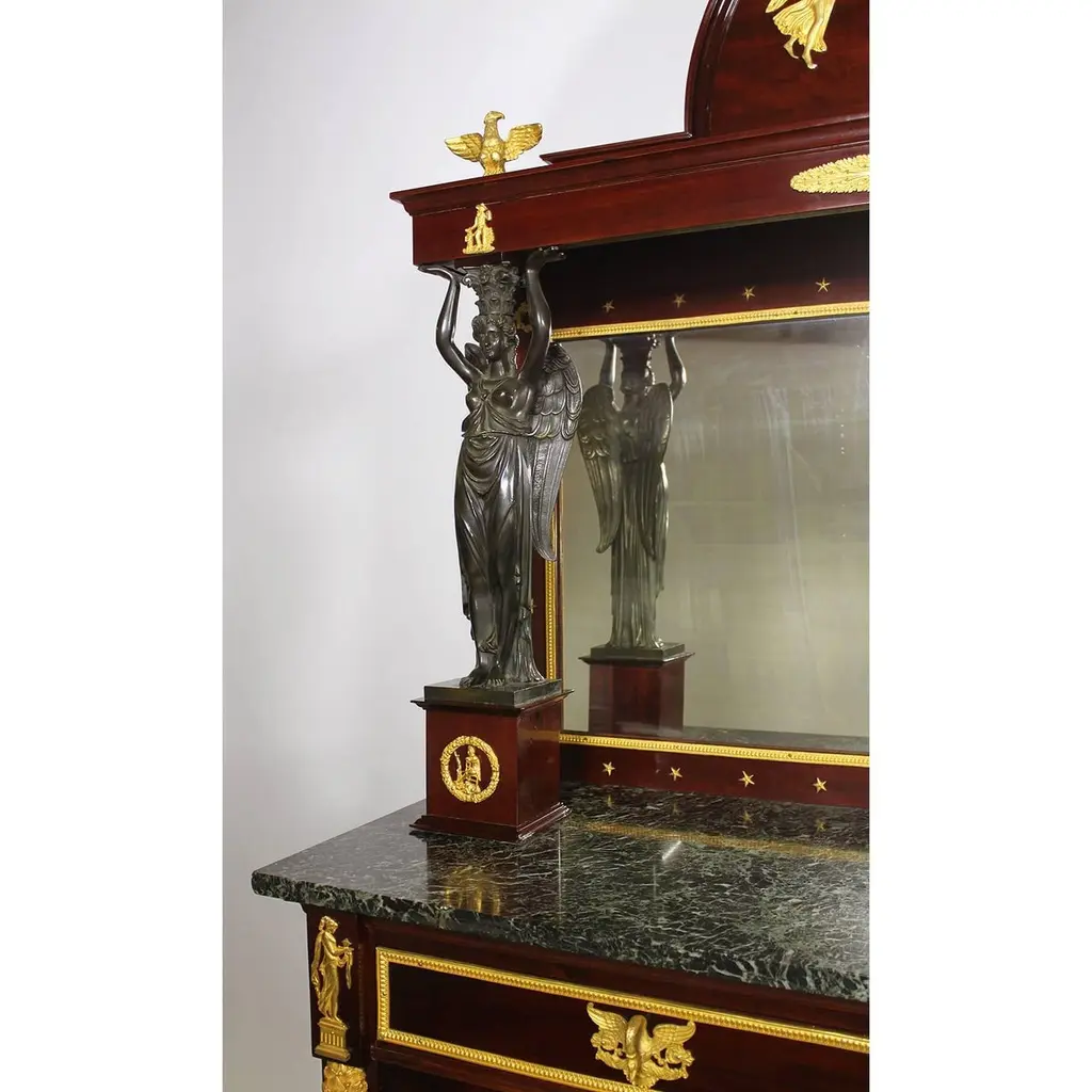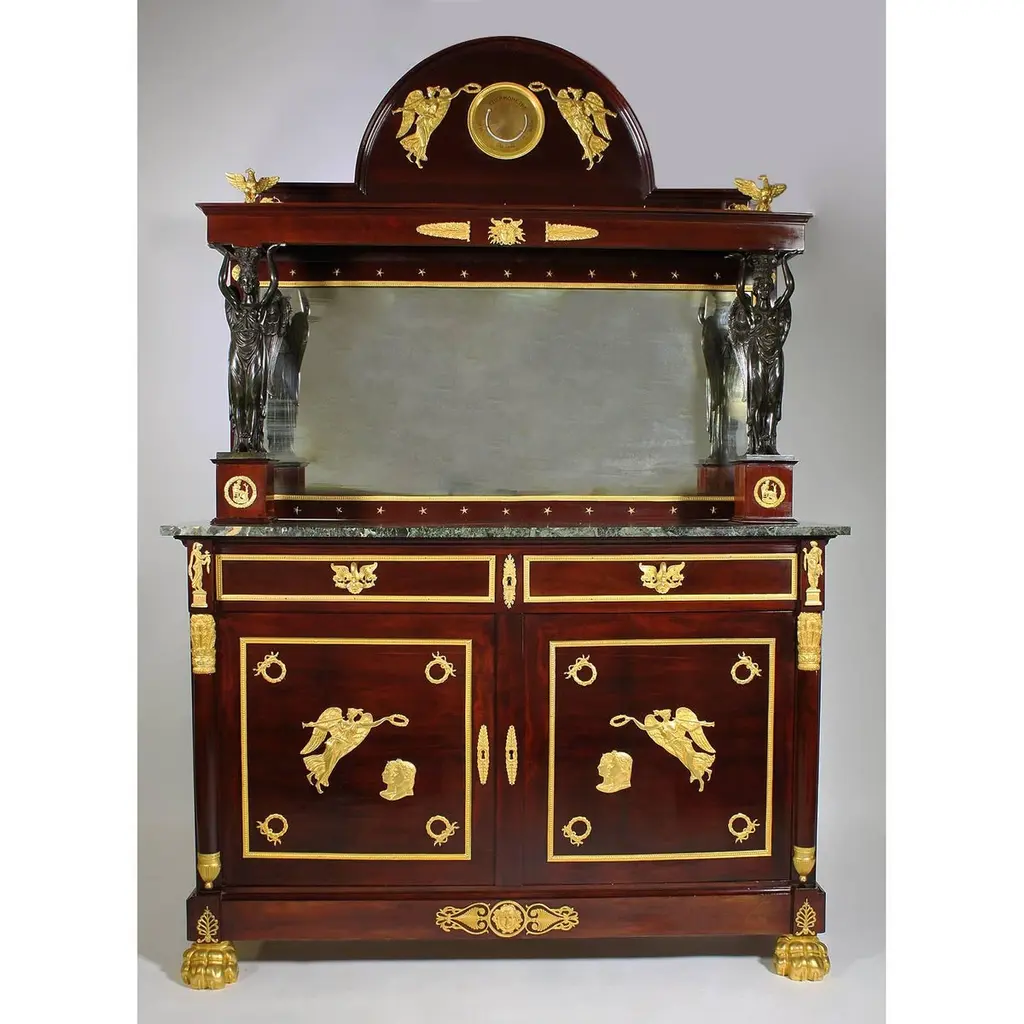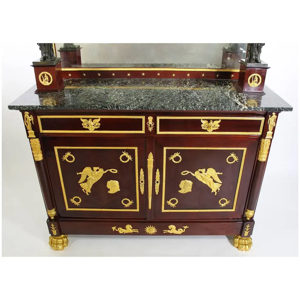 An impressive pair of Napoleon III Empire Revival mahogany, gilt-bronze and patinated bronze-mounted server buffets, after Pierre-Philippe Thomire (1751-1843), each cabinet surmounted with a pair of winged maidens on mahogany stands mounted with Napoleonic plaques, the frieze centered with a plaque of Medusa flanked by laurels above a green marble top. The splash backing with a framed mirror decorated with gilt-bronze stars. The domed top centered with a circular ormolu thermometer plaque surmounted with a pair of allegorical gilt-bronze winged maidens holding wreaths above a shelf surmounted with a pair of eagles. The lower cabinet with a pair of drawers with swan ormolu handles above a pair of storage doors with winged crowning maidens with trumpets and profiles of the Emperor Napoleon, all raised lion-paw, circa 1870.Measure: Height 88 1/4 inches (224.2 cm)Width 56 inches (142.3 cm)Depth 21 inches (53.4 cm).