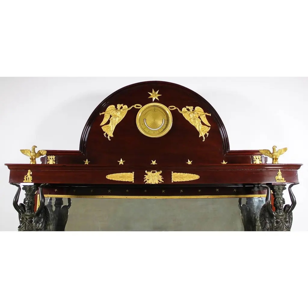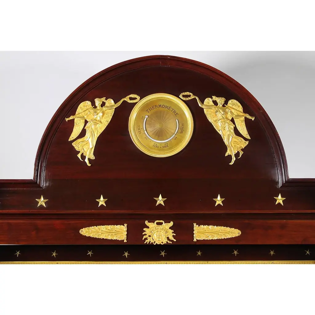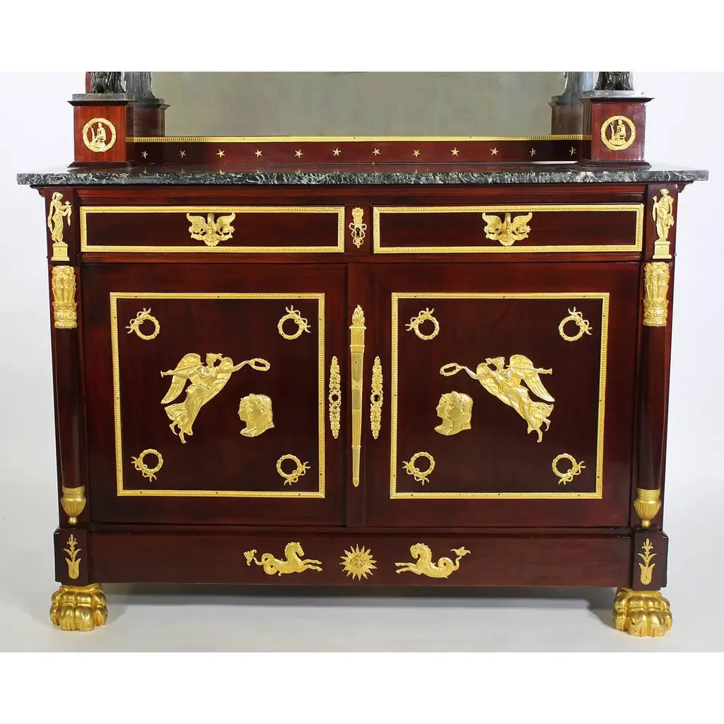 An impressive pair of Napoleon III Empire Revival mahogany, gilt-bronze and patinated bronze-mounted server buffets, after Pierre-Philippe Thomire (1751-1843), each cabinet surmounted with a pair of winged maidens on mahogany stands mounted with Napoleonic plaques, the frieze centered with a plaque of Medusa flanked by laurels above a green marble top. The splash backing with a framed mirror decorated with gilt-bronze stars. The domed top centered with a circular ormolu thermometer plaque surmounted with a pair of allegorical gilt-bronze winged maidens holding wreaths above a shelf surmounted with a pair of eagles. The lower cabinet with a pair of drawers with swan ormolu handles above a pair of storage doors with winged crowning maidens with trumpets and profiles of the Emperor Napoleon, all raised lion-paw, circa 1870.Measure: Height 88 1/4 inches (224.2 cm)Width 56 inches (142.3 cm)Depth 21 inches (53.4 cm).