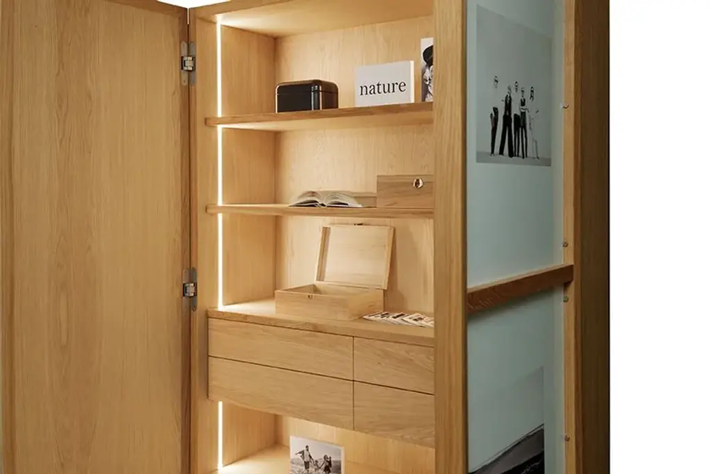 Neka is a sideboard with structure in veneered blockboard , characterized by special doors used as “frame” for photographs. Doors with solid wood edges and inner panel in blockboard on which the photographs are applied, and below a decoration with false drawer fronts. Inside drawers with push-pull opening system and illuminated by LED strips along the inner side, activated automatically via sensors when the doors are opened.AVAILABLE FINISHES:A1: walnut without knots, walnut with knotsA2: oak without knots, oak with knots, cherry