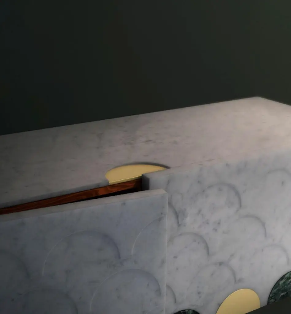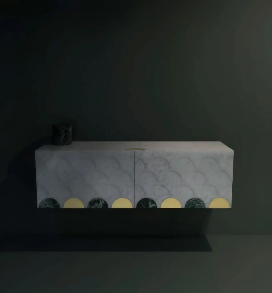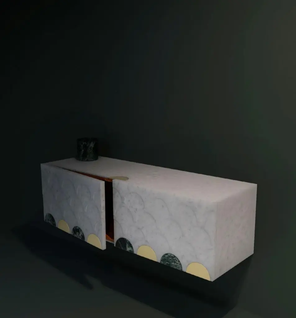 Nela cabinet by Marmi SerafiniMaterials: Marbles, brass; inner: Agglomerate of wood covered with laminateDimensions: H 42 x W 140 x D 46 cm.Marmi Serafini is located in a small city named Chiampo, internationally well known for its marble production.It's origins stem from Mr. Bruno Fortunato's passion for marble which was then passed on to his two sons, Alessandro ad Luca, who eventually took over.Marmi Serafini has, with the passing of time, transformed into one of the most innovative marble factories, producing extremely design-driven products and objects..