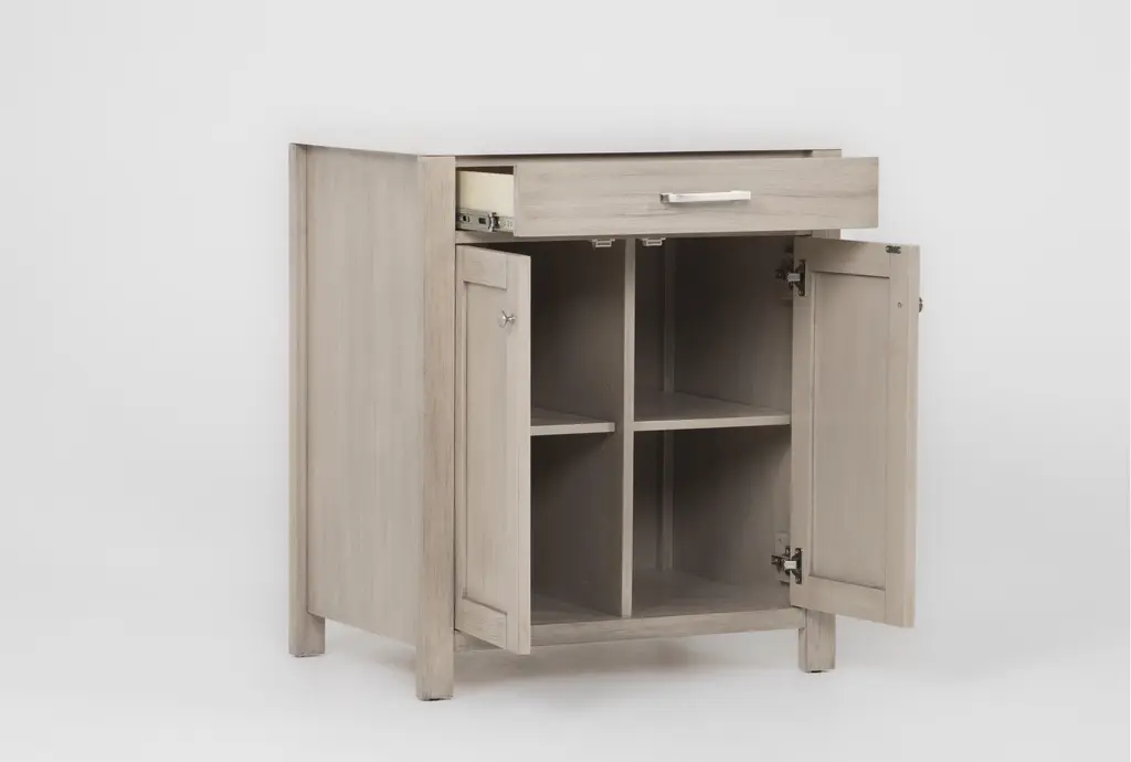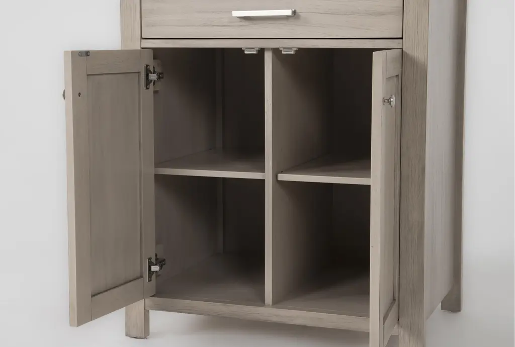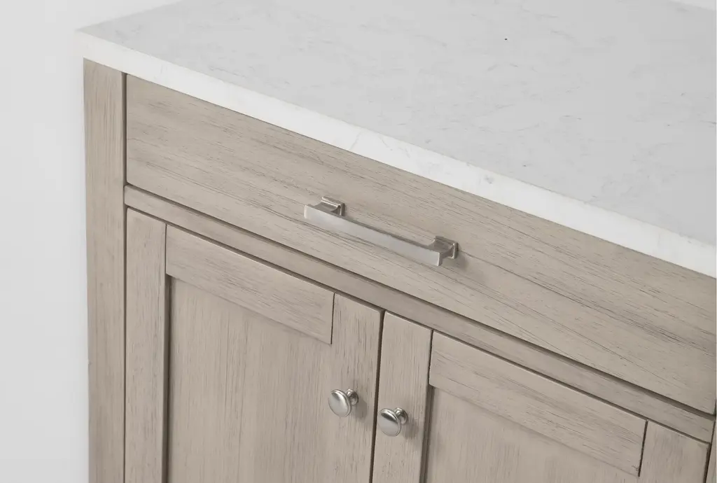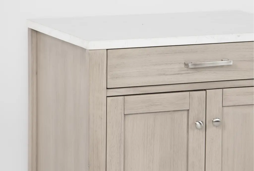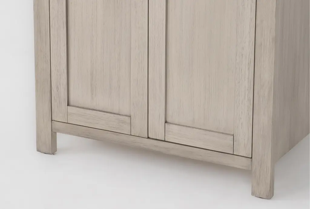 The Nelina Grey 2 Door Cabinet brings functional sophistication to your dining room. Crafted from solid rubberwood and rubberwood veneer over engineered wood, this modern cabinet features engineered stone detailing. Perfect for storage, it combines style and practicality with its convenient doors and durable construction.