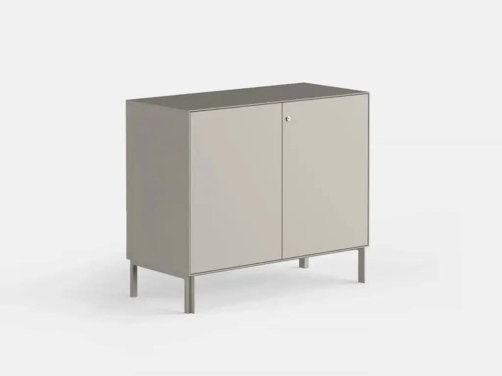New Order Combination 201 comprises a large, closed storage space with an adjustable shelf insert and open shelf space. This combination of elements provides an efficient and flexible space management solution where objects can be securely stored away or openly displayed. The aluminium grid is available in different colour options, with the possibility of adding panels, doors, trays and drawers to customize the appearance and functionality, creating infinite combinations and applications.