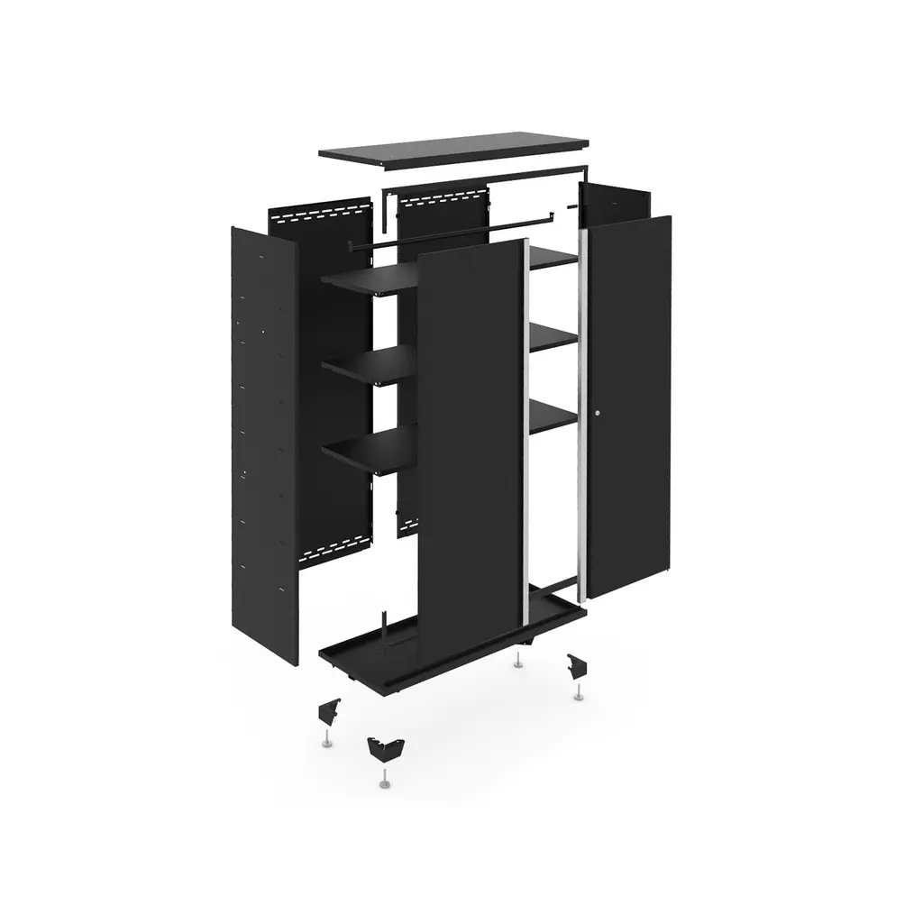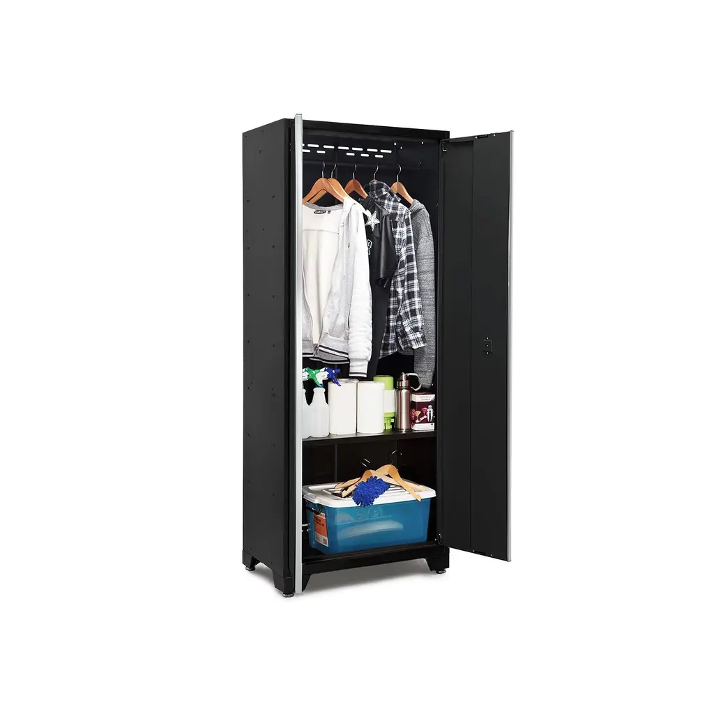 Designed for storing big and bulky items, the Bold Series 30 in. RTA Locker is the versatile storage solution to get your garage organized. The Bold Series 30 in. RTA Locker is a cost-effective storage solution that ships flat packed and is easy to assemble without any tools. While the RTA Locker differs from our fully-welded Bold Series Locker solutions in terms of assembly, it still shares all the features that make our Bold Series Lockers great. Built from powder-coat steel panels, our RTA Locker keeps your gear safe behind lockable doors with full-length integrated handles, for quick access and a space-saving design. The durable paint finish not only looks great, but also improves the corrosion resistance of the cabinet and stands up to the demands of everyday use. The Bold RTA Locker comes equipped with 3 easy-to-adjust steel shelves that can be repositioned in 8 inch increments to provide personalized storage for all sizes of items, and a removable closet rod for hanging storage. The integrated cable access hole allows you to keep your power tools and electronics charged behind locked doors. The Bold Series 30 in. RTA Locker is great for standalone storage, but also integrates beautifully with all NewAge Products Bold Series cabinetry.