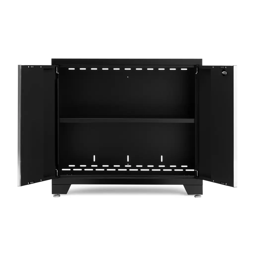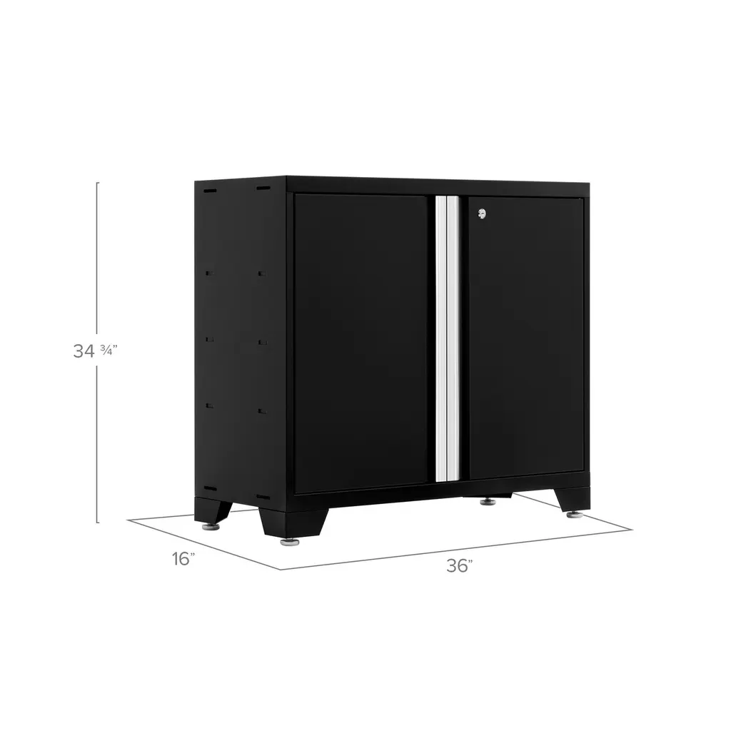 Store even more gear with the Bold Series 36 in. Base Cabinet. With more interior storage space than our 24 in. Base Cabinet, you'll fit more gardening supplies, kid's toys, sports gear, car care supplies and other items to make your garage the most organized space in your home. The fully-welded steel frame supports up to 600 lbs. of weight to take on the heaviest jobs like storing paint cans, soil, and equipment. The included shelf is height adjustable in 6-inch increments so you can get exactly the storage you need. Lockable reinforced steel doors feature integrated full-length handles for a modern look that offers more clearance in front of the cabinet. A cable management port at the base of the cabinet lets you feed power to chargers and electronics. The durable paint finish that helps protect against spills and rust, with a choice of colors to look good in any space. The Bold Series 36 in. Base Cabinet gives you the durable, versatile storage solution you need.