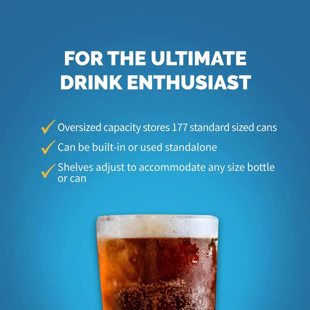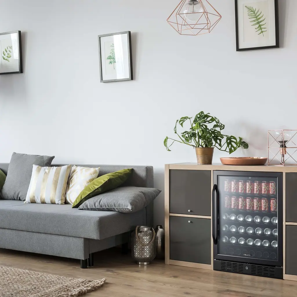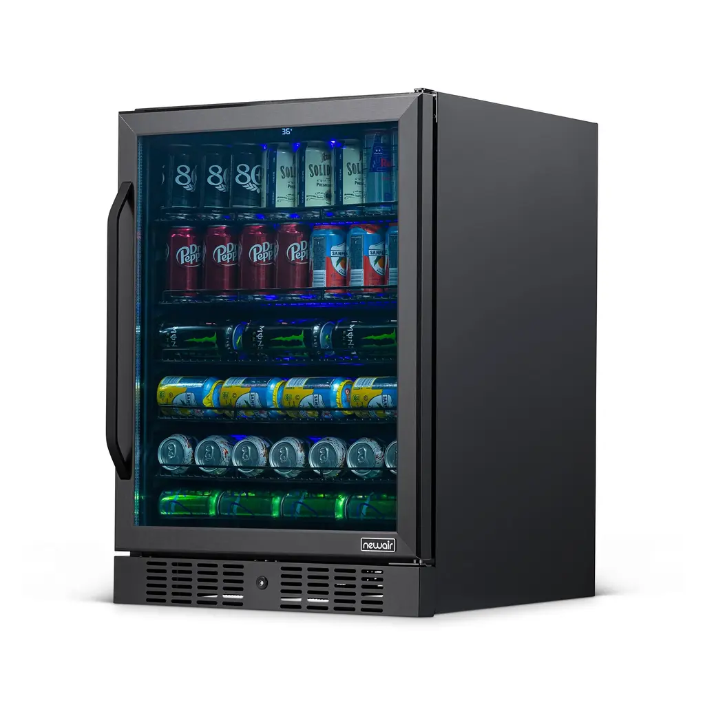 The modern Newair 24" Built-in 177 Can Black Stainless Steel Beverage Fridge with Pro handle is the ultimate entertainer's fridge. With room for a whopping 177 standard cans of beer or soda, you'll never run out of drinks for the whole party. This model can stand alone or slide into your cabinets for a streamlined look. The precision thermostat lets you pick the ideal temperature from 37°F to 65°F, so everything from craft beer to icy cold carbonated drinks always tastes its best. With adjustable shelves, this sleek Black Stainless Steel Beverage Fridge allows you to create customized storage for all your favorite beverages. There's even a lock and key to keep your adult drinks from falling into the wrong hands.FeaturesBenefits 1. We Raised the Bar on Mini Bar! With space for up to 177 standard cans, you can fit all the drinks you want inside, so you'll never be left high and dry in the middle of a party or potluck. The Newair Built-in 177 Can Black Stainless-Steel Beverage Fridge is perfect for entertaining – you'll have drinks for family or for a crowd. 2. Built-in or Stand-alone Installation: The quiet, front-venting compressor system allows this beverage fridge to fit snugly under standard kitchen counters. Just slide it into place for a sleek, integrated look that blends perfectly with your cabinetry and appliances – or let it stand alone. The choice is yours; this black stainless steel beverage fridge works in any room of the house including home office, studio apartment, man cave and more. 3. Triple-Paned Glass Doors Keep It Cold: The triple-paned glass door provides outstanding insulation to keep all that cold air inside. With airtight door seal, durable black stainless steel door frame, this beverage cooler is not only attractive but can also be locked for peace of mind. The finishing touch? Interior blue LED light for a modern look. 4. Accurate Digital Thermostat: This 177 can black stainless steel beverage refrigerator features digital temperature controls that put you in charge. Dial it all the way down to 37 degrees for icy-cold sodas or turn it up a bit to keep craft brews at their best. With a temperature range of 37°F-65°F, you can keep your favorite drinks ready to serve – whether you're hosting a dinner party or just kicking back after a long day. 5. Adjustable Storage Shelves for Flexibility: The shelves of the Newair 24” 177 can built-in beverage fridge can be adjusted to make room for oversized bottles and containers of all shapes and sizes so you can keep all your drinks in one place. The interior LED lets you show off your craft beer collection.