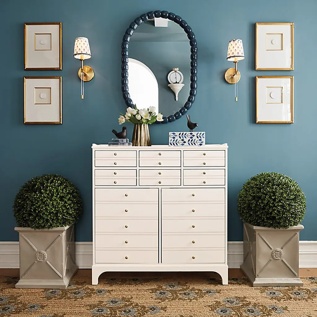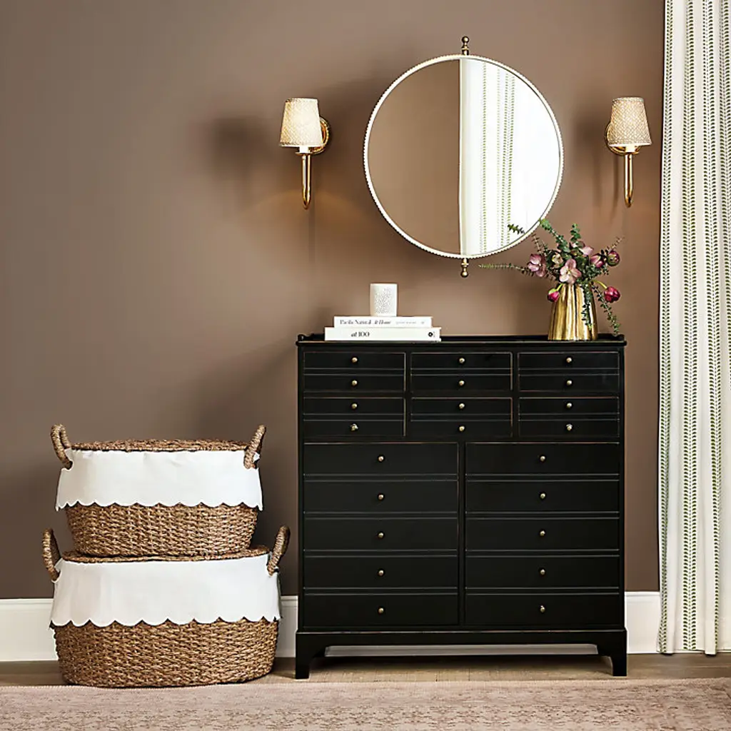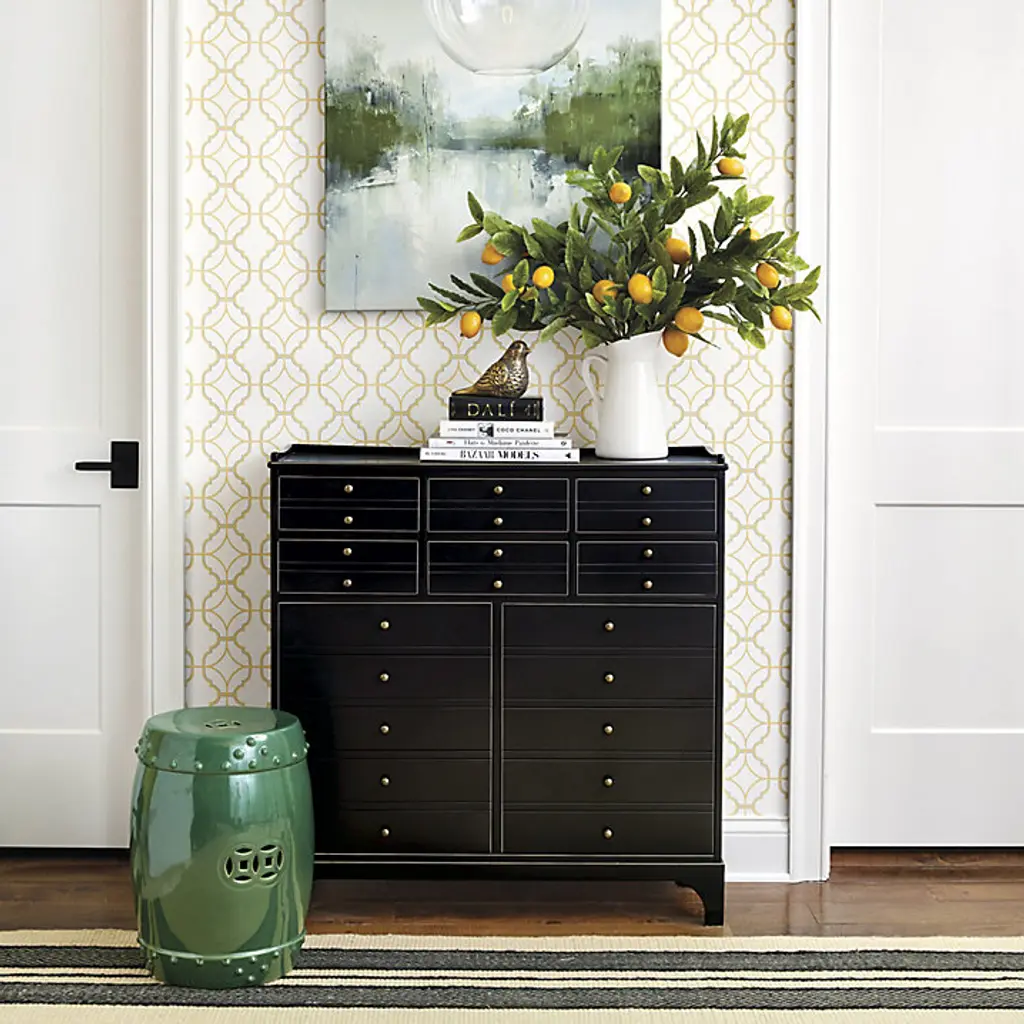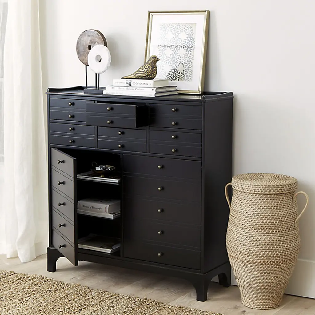 A vintage apothecary look outside that reveals storage, storage, storage inside. The Nina Apothecary Cabinet features six real drawers and two cabinets below with two adjustable shelves on each side. Holds wardrobe necessities, stores supplies in the office, or acts as a catch-all in the hallway. Nina Apothecary Cabinet features: