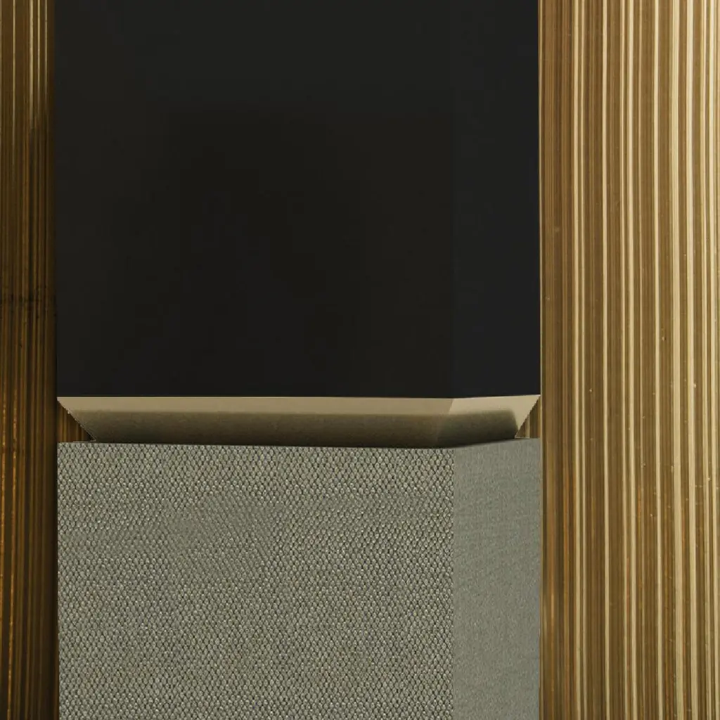 A sculptural piece of functional decor, this cabinet will make a bold statement in a modern interior. Elegant and sturdy, it features an upper element fashioned of black-lacquered wood, and a lower part upholstered with a refined sand-colored fabric. Connecting the two pieces, a gold-finished brass element enriches this unique design. The wooden interior features smokey glass shelves and a bright mirror on the background.