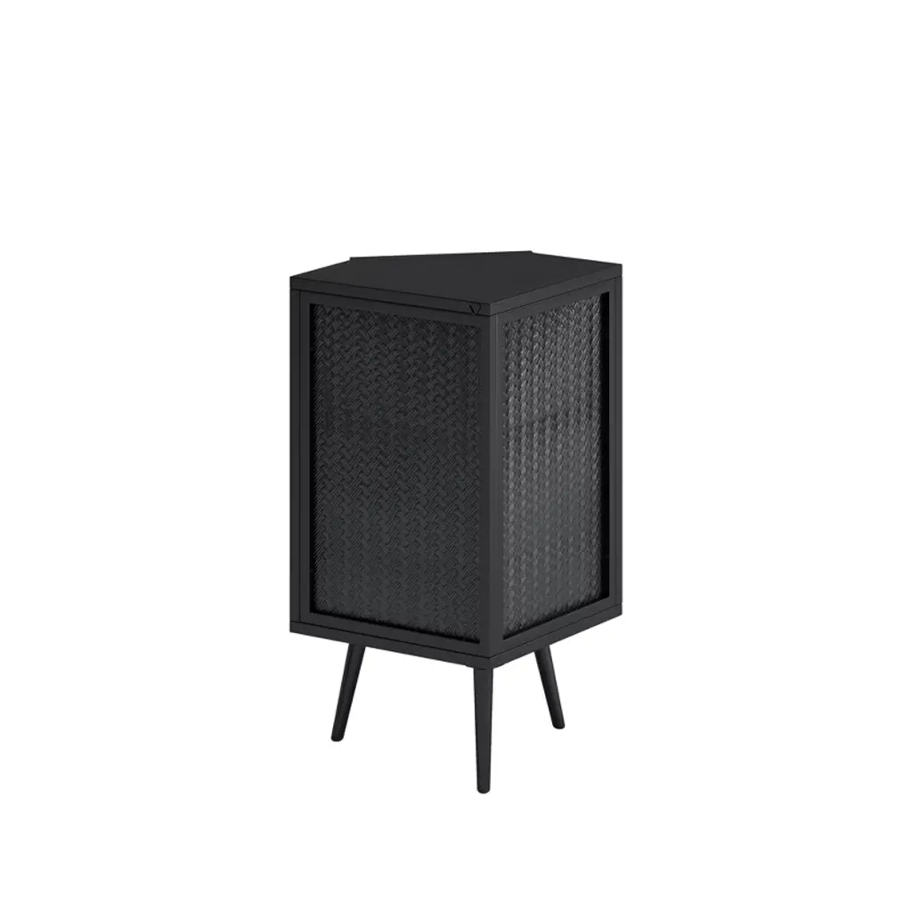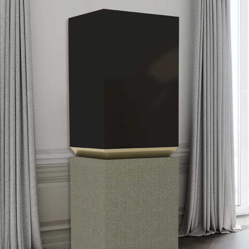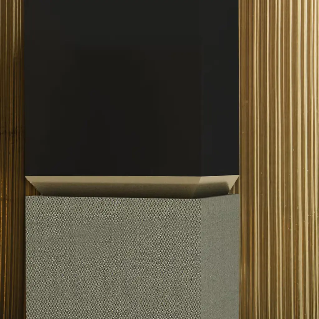 A sculptural piece of functional decor, this cabinet will make a bold statement in a modern interior. Elegant and sturdy, it features an upper element fashioned of black-lacquered wood, and a lower part upholstered with a refined sand-colored fabric. Connecting the two pieces, a gold-finished brass element enriches this unique design. The wooden interior features smokey glass shelves and a bright mirror on the background.