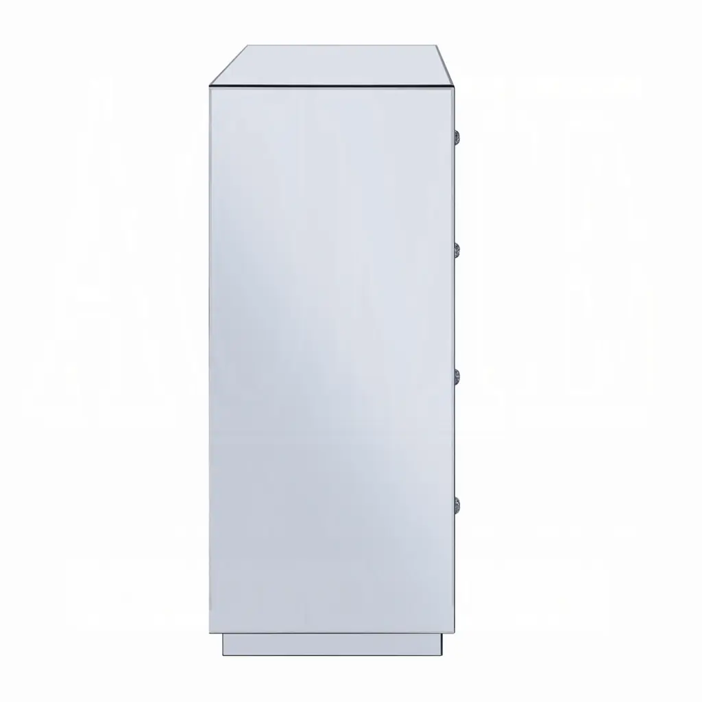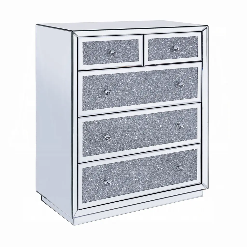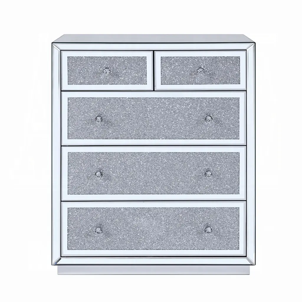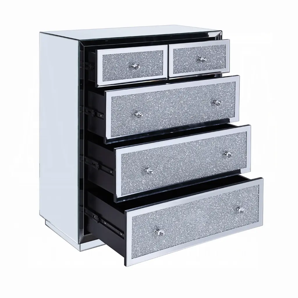The Rekha Console Table will give any room a touch of glamour. This contemporary console table is fully mirrored with a beveled edge and a stunning mirror top and drawer fronts with faux crystal inlay. Use this unique piece as the perfect accent for any room Decor. Three large drawers and two small drawers provide ample and convenient storage for books, remote controls, jewelry, and more.