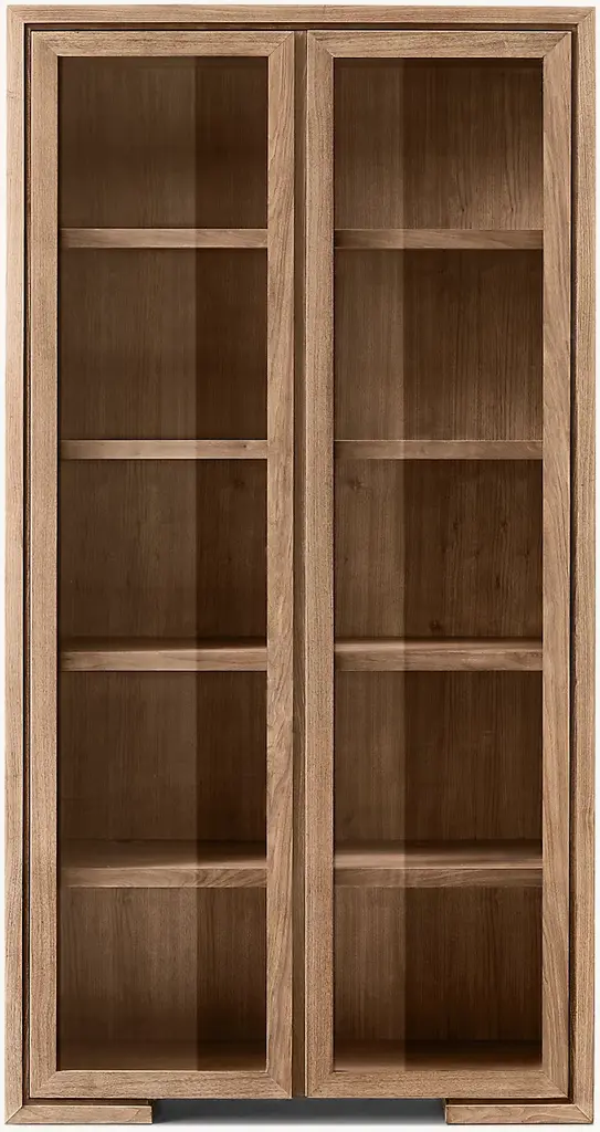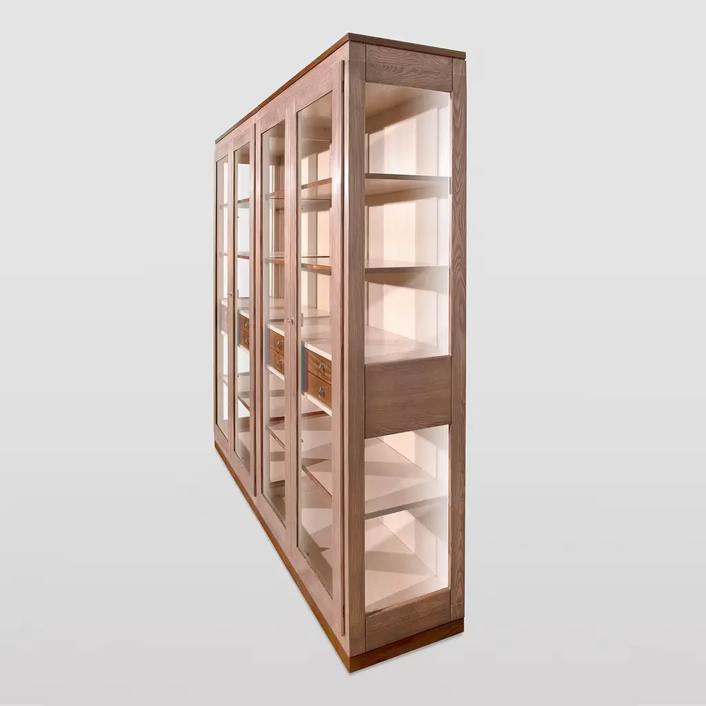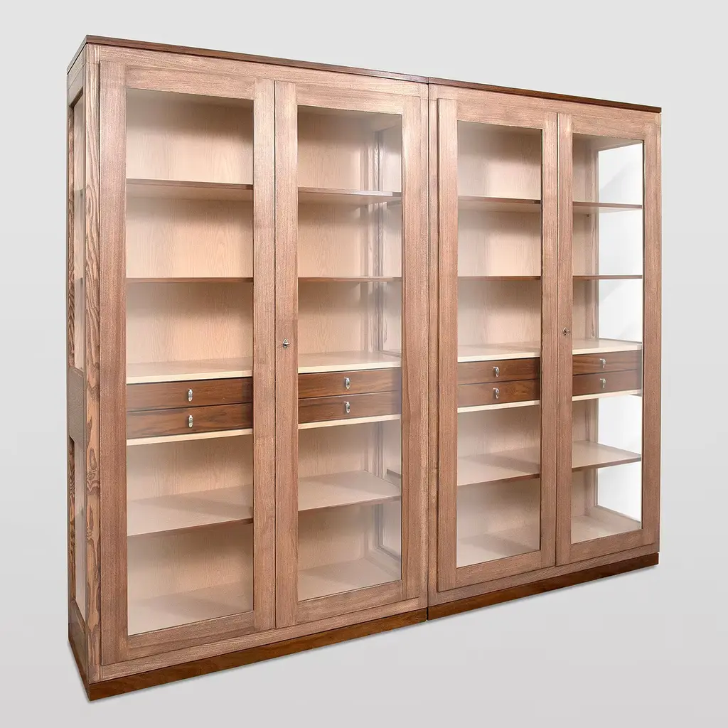 Designed by Erika Gambella, this modular bookcase flaunts a clean and functional shape typical of Nordic design. Furnished with eight internal drawers and six wooden shelves, it is handcrafted using high-quality techniques, adding to its refined and elegant value. Fashioned of solid Daniela walnut and ash wood, it is completed with glass doors and glass sides and finished with eco-friendly water-based products and beeswax. Entirely customizable, please ask the Concierge for further details.