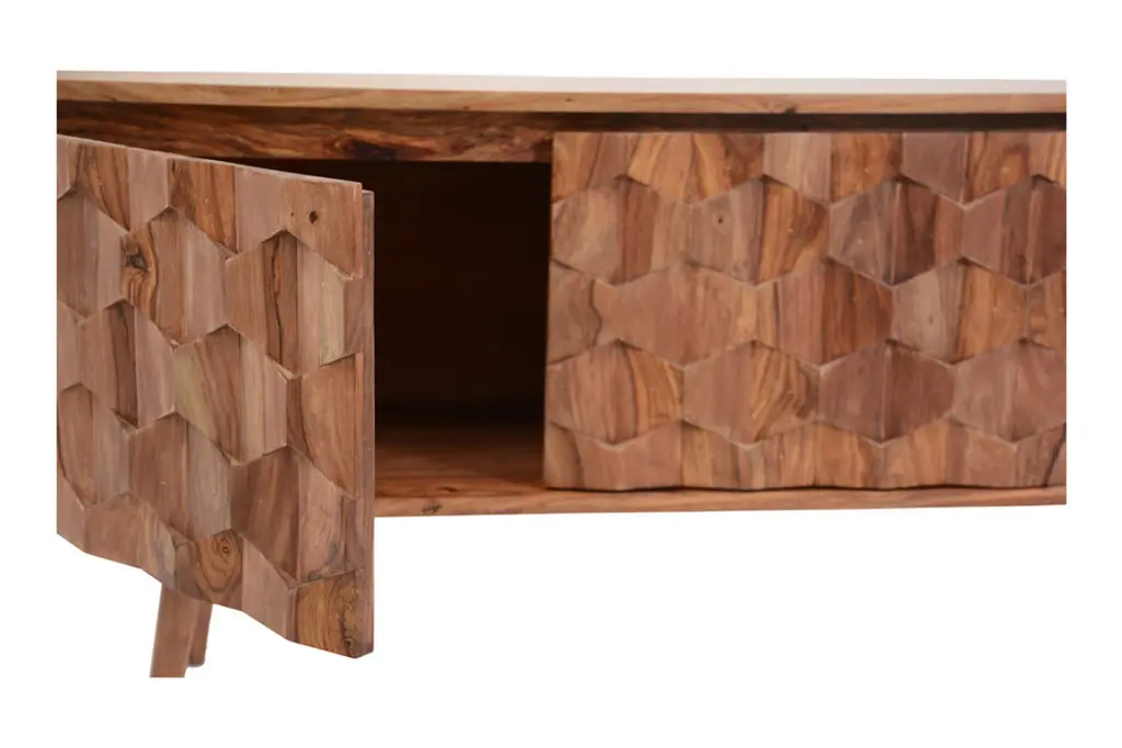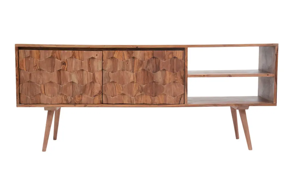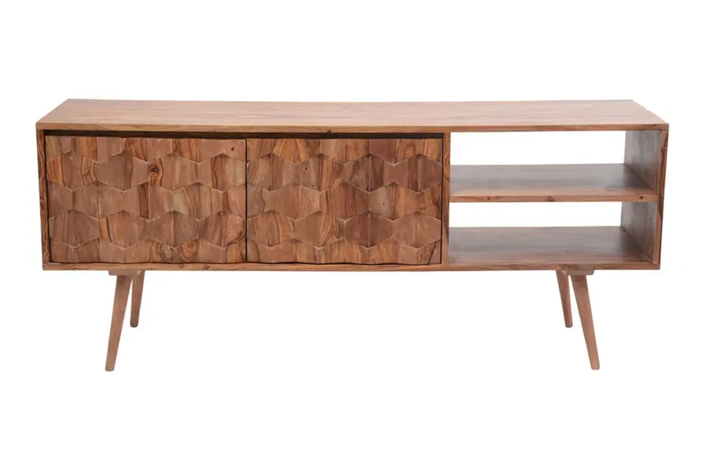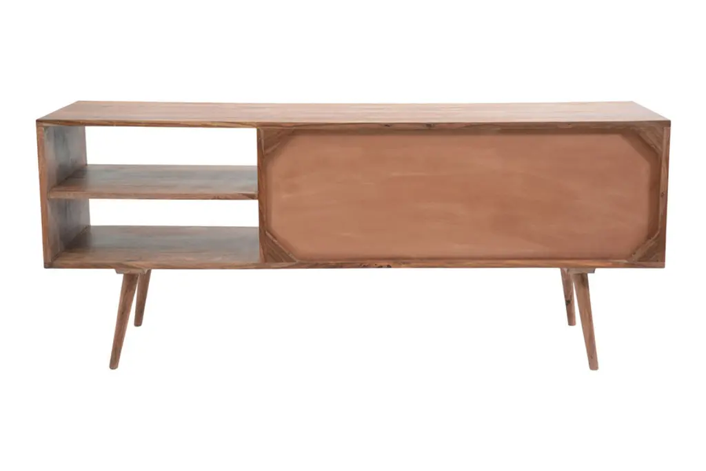 Made from gorgeous and durable sheesham wood, the O2 TV Cabinet from Moes Home Collection perfectly blends beauty and utility while fitting perfectly in your living room or bedroom. Two shelves on the right-hand side allow you to house your devices while an oversized cabinet on the left keeps your media collection organized. Rarely does a media stand overshadow the TV that sits on it. If you find your eyes drifting away from the TV, its perfectly normal with the O@ TV cabinet.