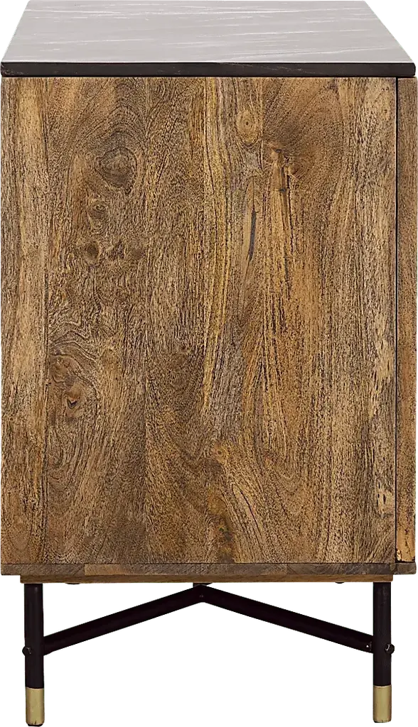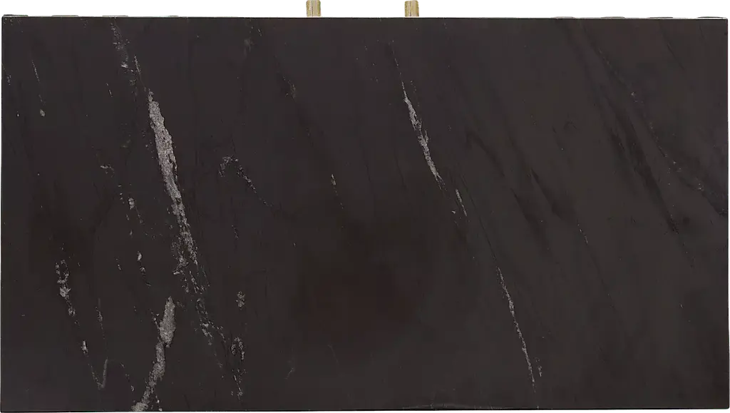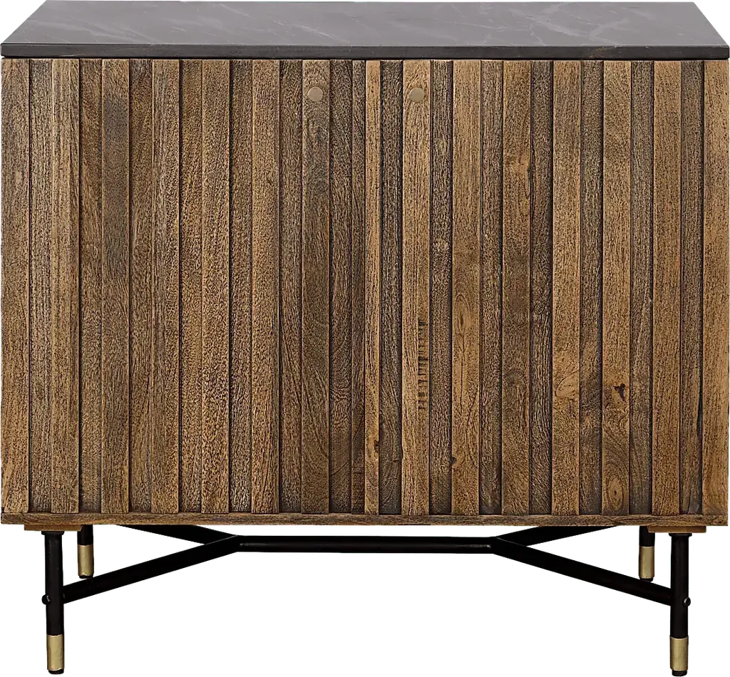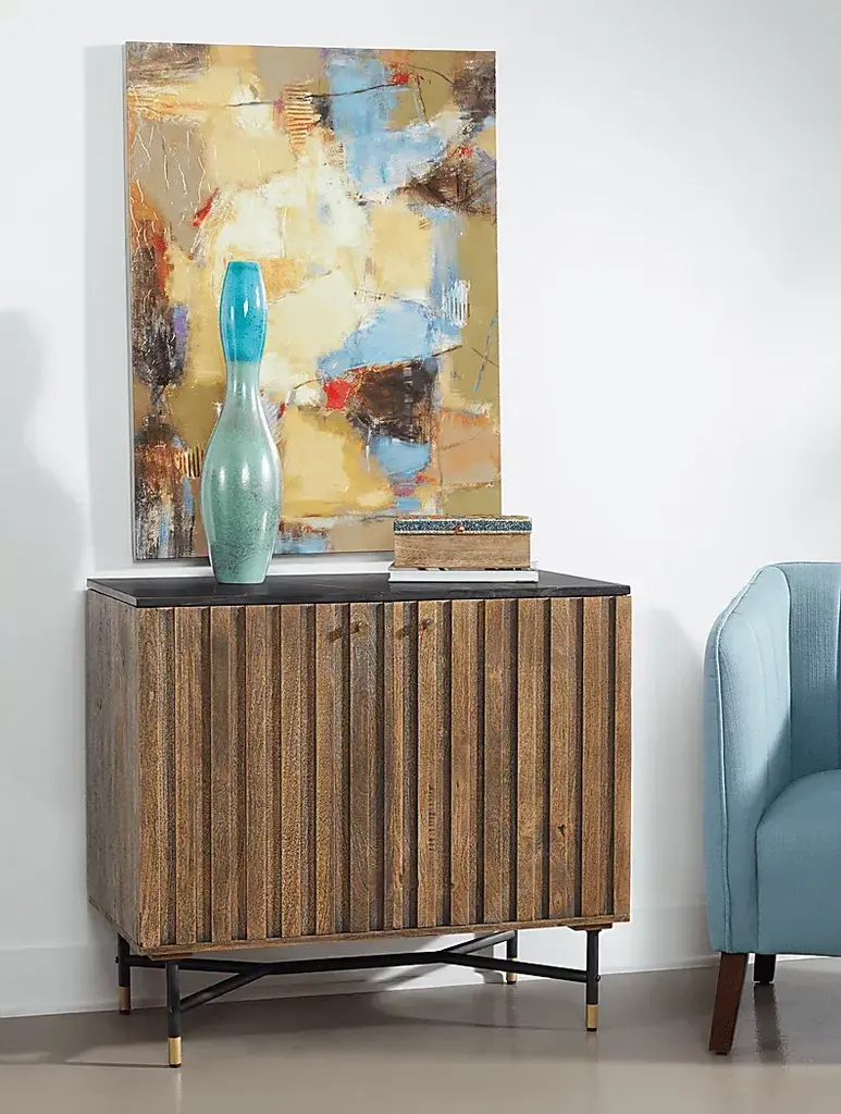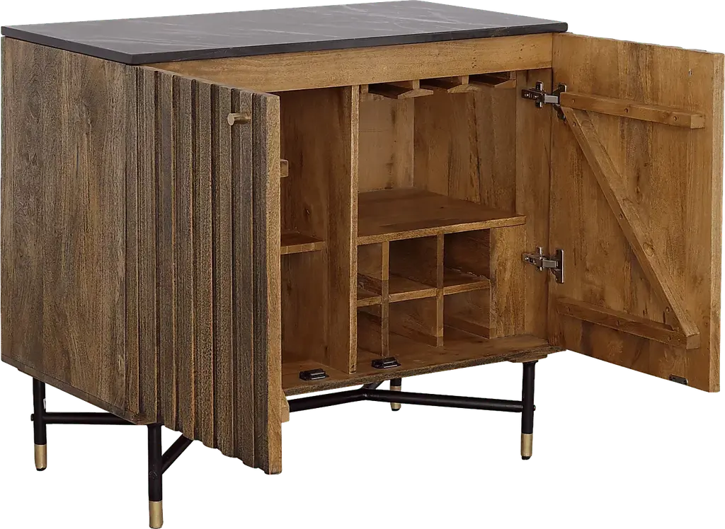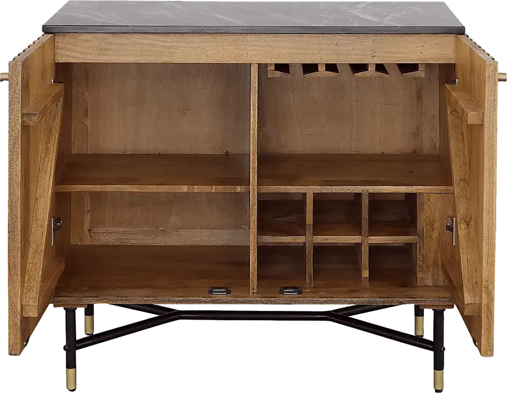 Add storage for all of your serving essentials while making a statement with this Oaklett two door bar cabinet. The naturally sourced black marble top features unique white veining and is supported by a solid mango wood frame. Metal accents and hardware add a touch of gold to the lightly stained natural mango wood finish. The interior features two fixed shelves, stemware rack, and a convenient six bottle storage compartment. With its high quality craftsmanship and sleek design, it will make a statement in any home for years to come. Customer assembly is required.
