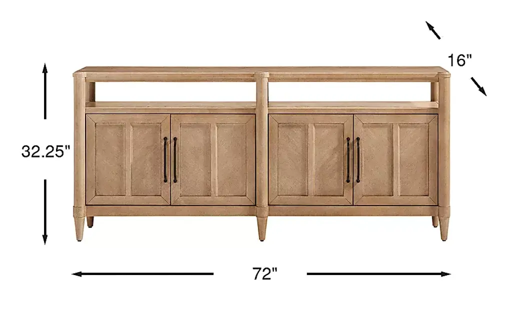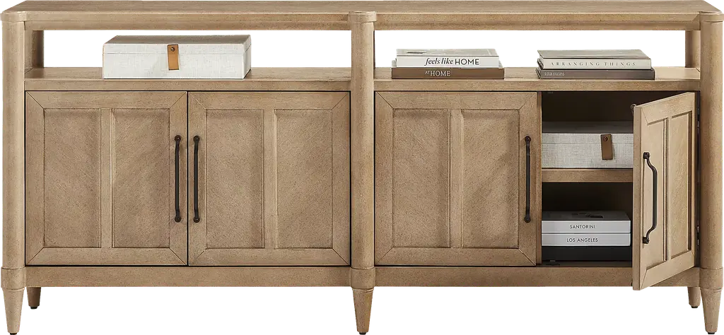 The gentle tones and casual elegance of the Oakwood Terrace collection brings soft, breezy sophistication to your home entertainment center. This console features a sandy beige finish and a clean rectangular frame, offering a warm, grounded look that suits both casual and elevated interiors. Two pairs of paneled cabinet doors open to reveal spacious shelving for tucked-away storage, while two open shelves at the top provide easy-access display space or room for media devices. Tapered legs and elongated black metal pulls add subtle contrast and tailored appeal, making this console timeless and refined.