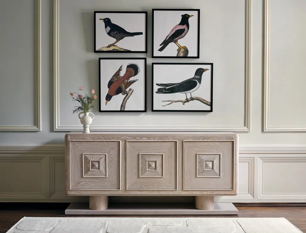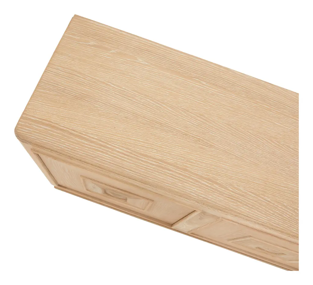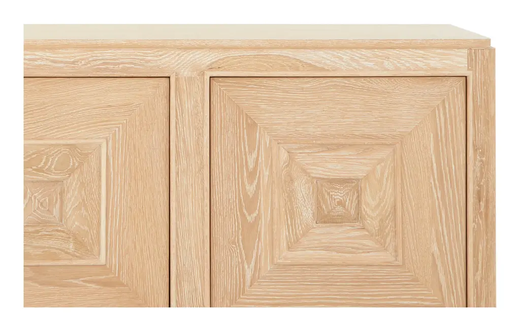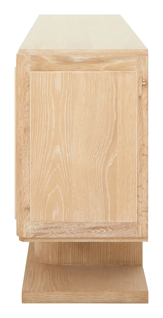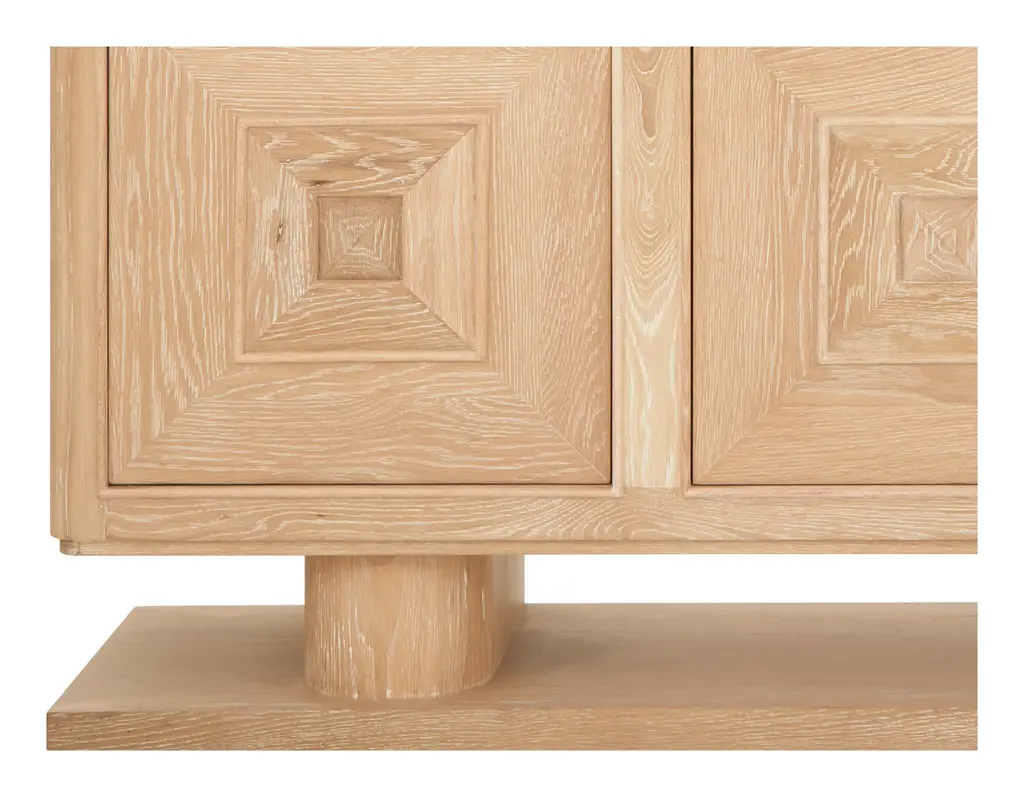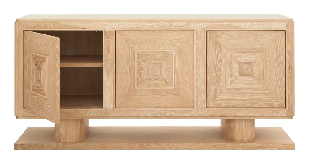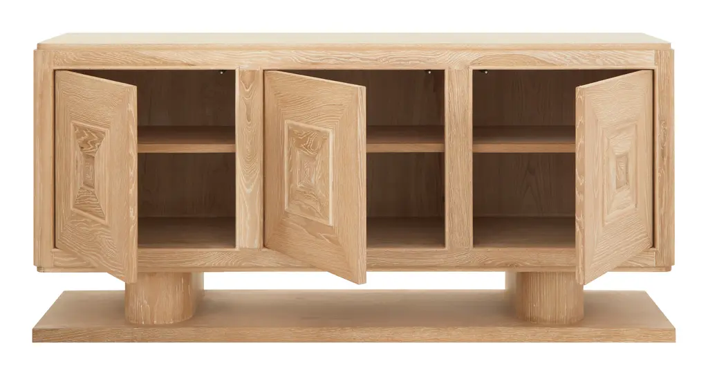 An expert blend of style and storage, our Obispo Credenza is the perfect anchor piece for any modern space. Crafted from solid oak into a blocky, clean-lined silhouette, this striking sideboard rests on two chunky, rounded legs and a unique plank-like base. All of this is coated with a bleached cerused finish, which adds a light and airy feel to its otherwise commanding presence while also highlighting its natural wood graining. Along with these good looks, you'll also find three push-to-open doors cabinet doors, which are each decorated with dimensional, pyramid panel details and swing open to reveal two spacious shelves. Versatile enough to play a starring role in just about any room of the house, we love Obispo as a media console in the living room; as a buffet filled with dishes and table linens in the dining room; as a handsome home bar that can hold a collection of spirits and glassware; or as a chic and stately entry table with plenty of space to stash the inevitable clutter. •oak•cerused finish•three push-to-open cabinet doors Dimensions •72.75"W x 18"D x 34"H•top shelves: 24"W x 16.25"D x 8.5"H•bottom shelves: 24"W x 16.25"D x 10.25"H
