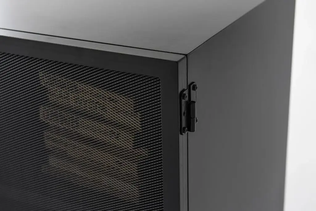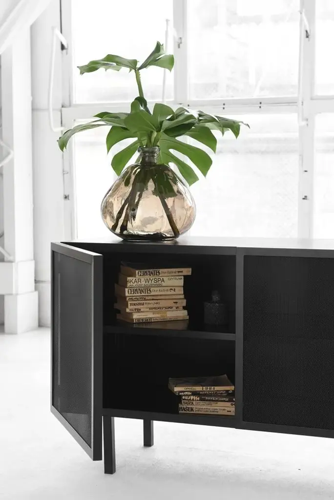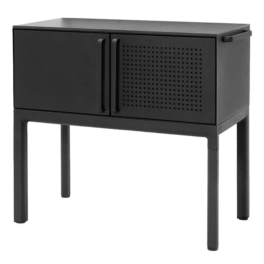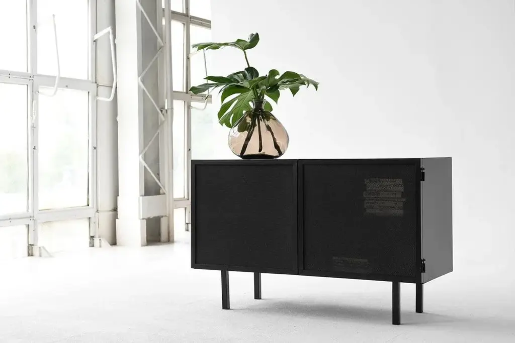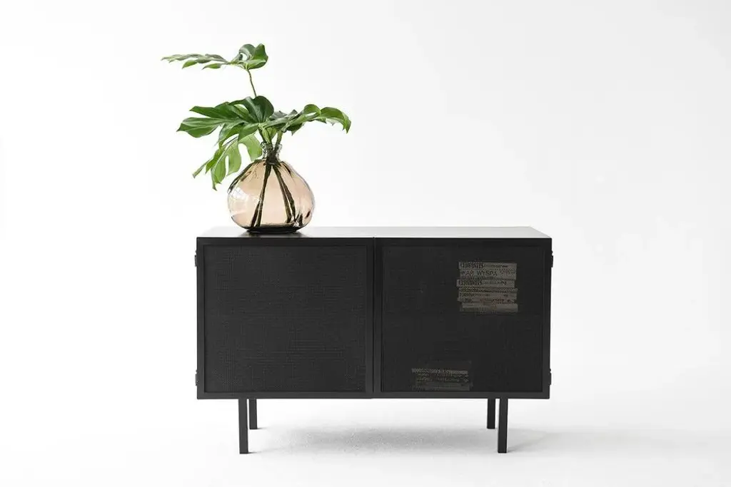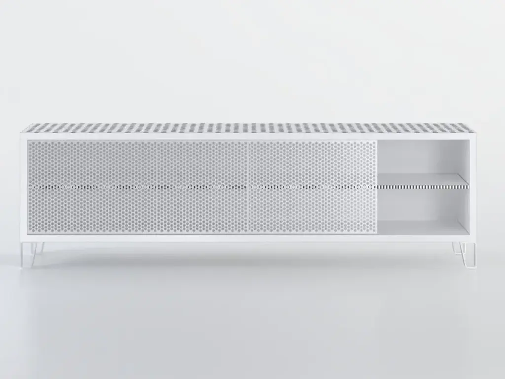 Object 001 cabinet by ng design dimensions: d 115 x w 50 x h 76 cm. Materials: powder coated steel. Also available: all of objects available in different materials and colors on demand. A chest of drawers made from powder-coated sheet steel with an expanded metal door is perfect for a subtle display of your book collection or favorite dinnerware. The semi-permeable metal foil creates an unconventional effect and adds lightness.
