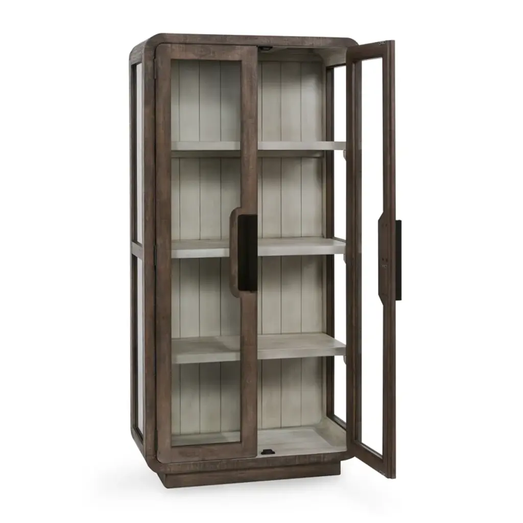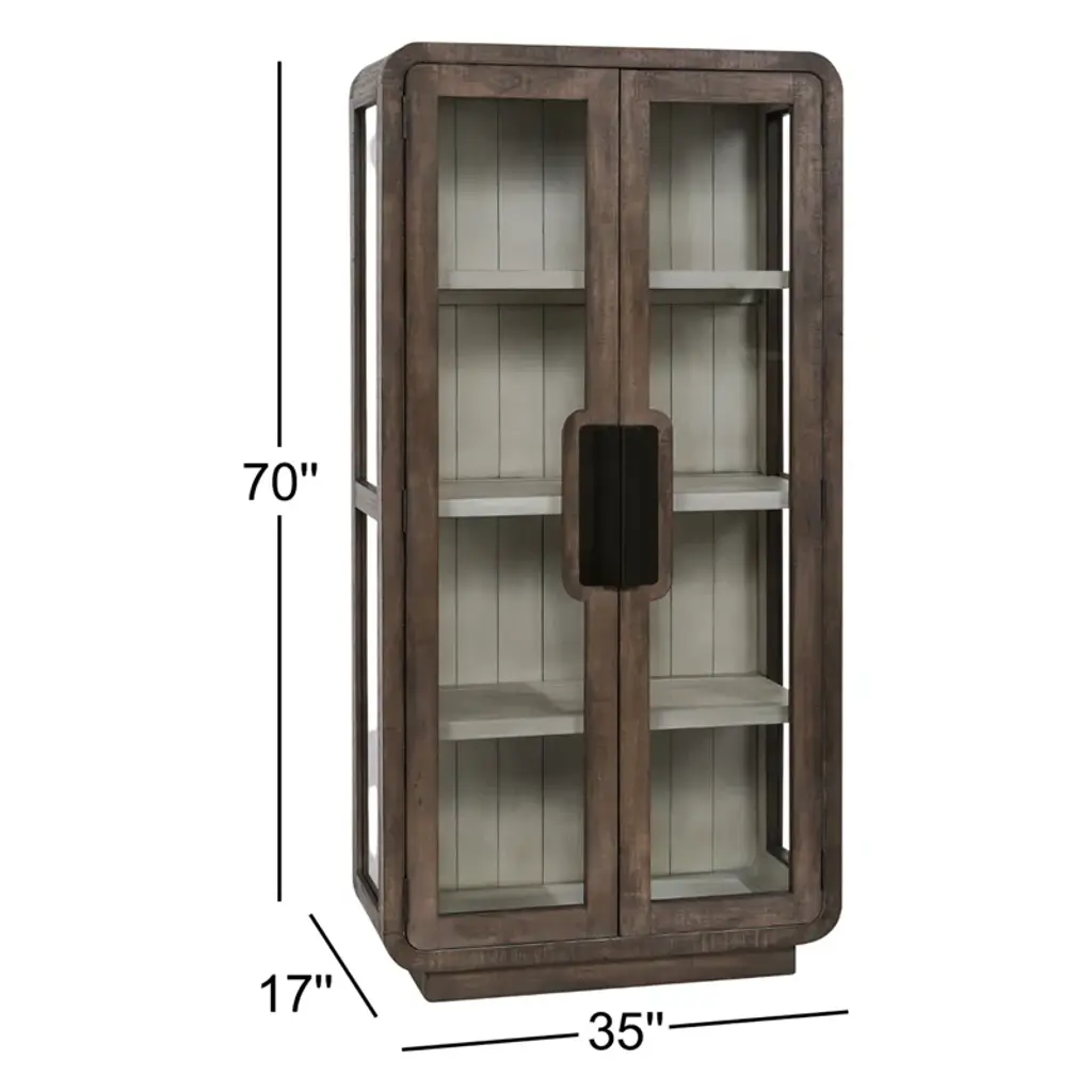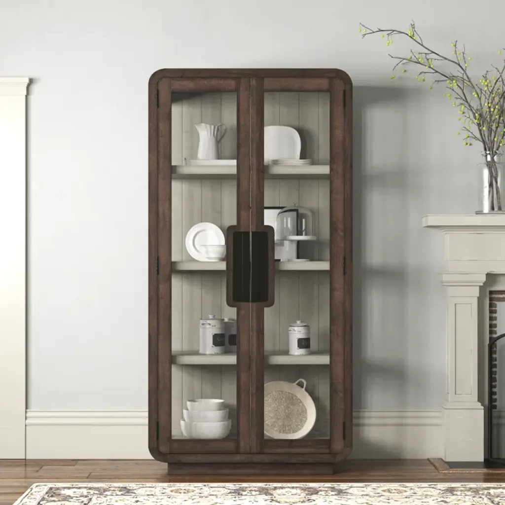 Show off your favorite treasures in this rustic-inspired curio cabinet. Made from solid pine wood, it features two hinged glass doors that open to reveal four adjustable wood shelves, providing ample space for your cherished collectibles. The tempered glass ensures added safety, while the natural wood grain lends a warm, inviting touch to any room. Although it doesn't come with built-in lighting, you can always add your own to make your display shine. Just remember, this cabinet is designed for home use, so it's perfect for showcasing your personal style.