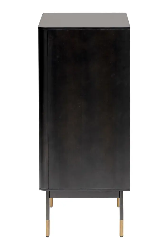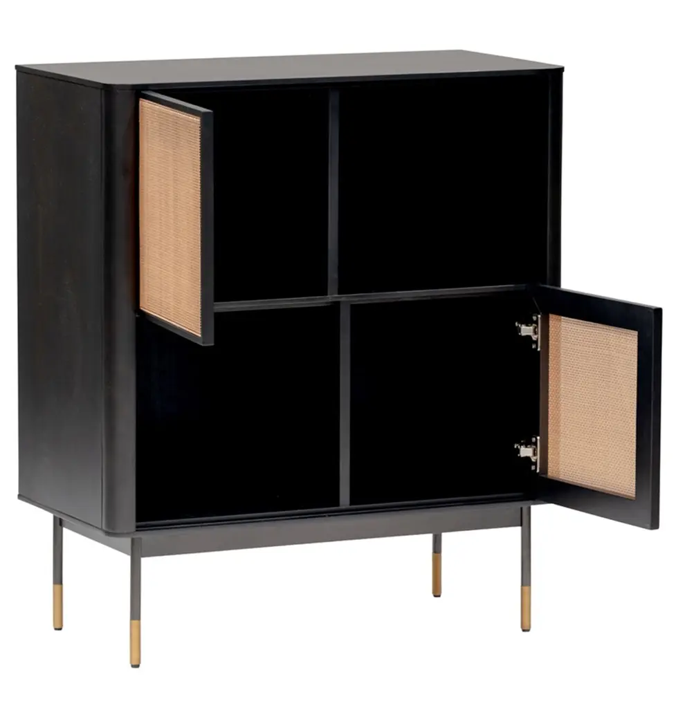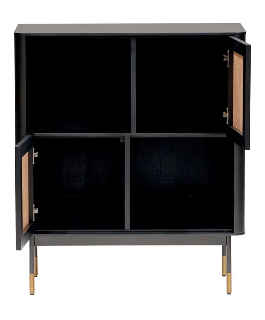 Fans of contemporary design will be drawn to the minimalist silhouette and the black-and-bronze steel legs of this cabinet. Those who gravitate toward natural materials will love the two woven rattan door fronts. And just about everyone will appreciate the generous storage and display space.