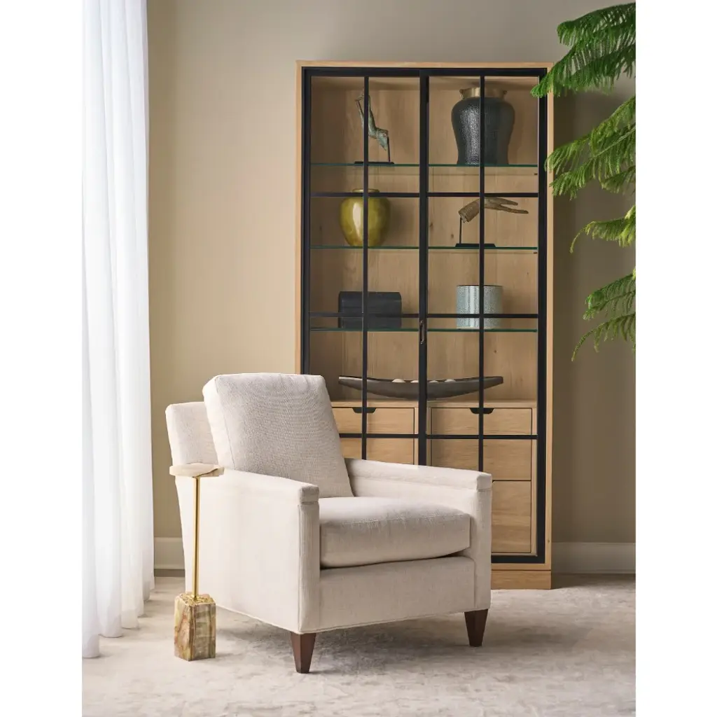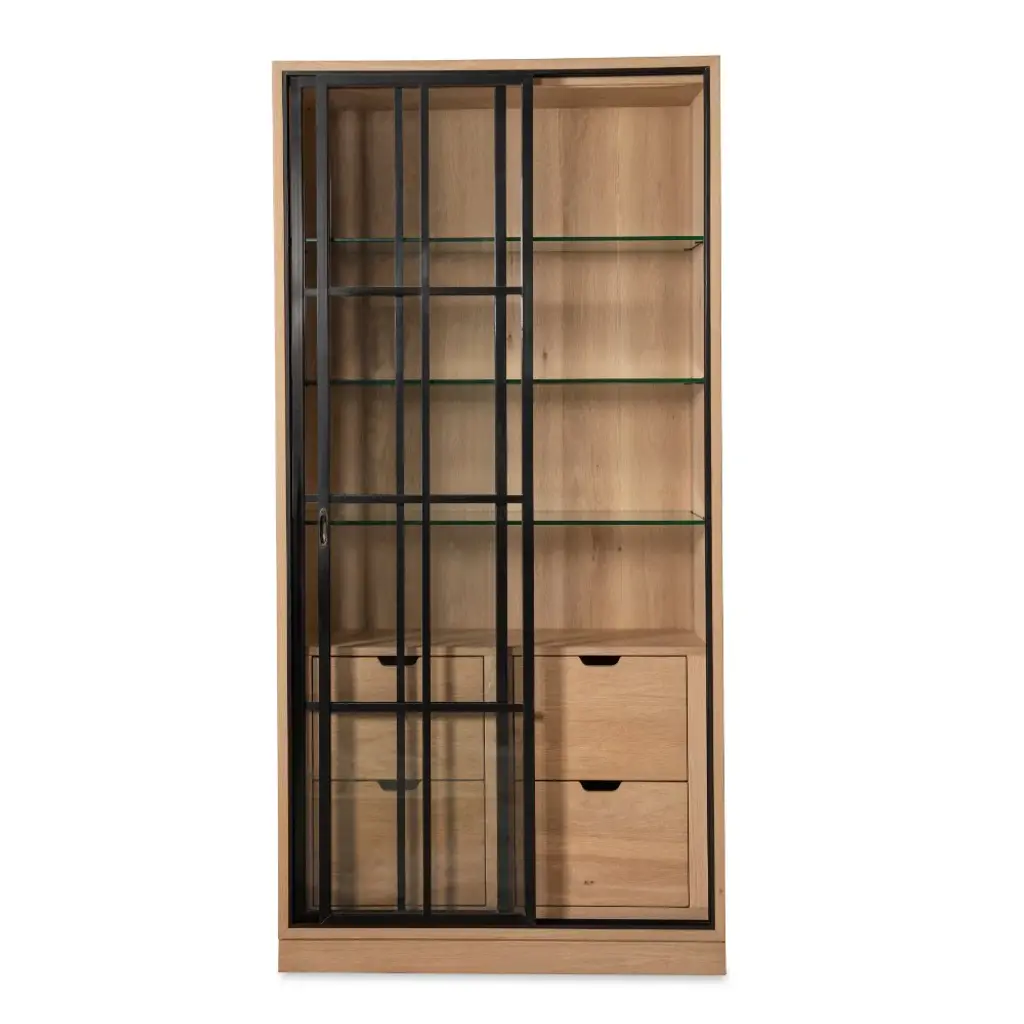 With adaptability to all styles, this display cabinet will add a chic component to your space. The bronze rubbed metal and glass sliding doors open to adjustable glass shelves and pull-out drawers. From a living space to an office, this beauty will surely enhance any display.