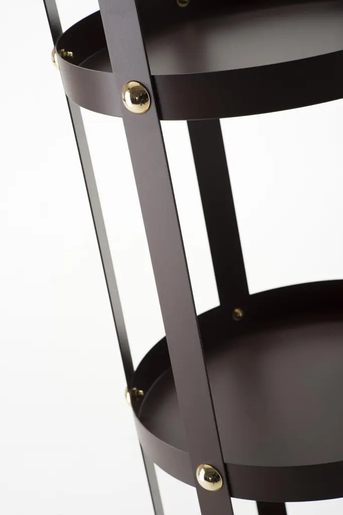 La Gabbia, Lapo Ciatti's storage cabinet is a sculptural element of scenic impact made of metal and aluminum, embellished with 24 glossy studs. La Gabbia is a practical organizer equipped with four shelves. Ideal as a library, it allows a variety of uses thanks to the freedom of arrangement of each element. Its particular shape enhances its containing capacities and its sophisticated design perfectly fits in every room, both in living and sleeping areas. Available in three different finishes (black varnished with black nickel studs, corten effect with gold studs and stainless steel with chrome studs) it can be adapted to classical or contemporary contexts, always succeeding in generating a sophisticated, elegant and unique environment.